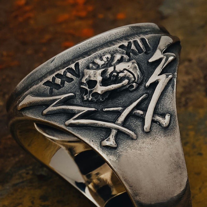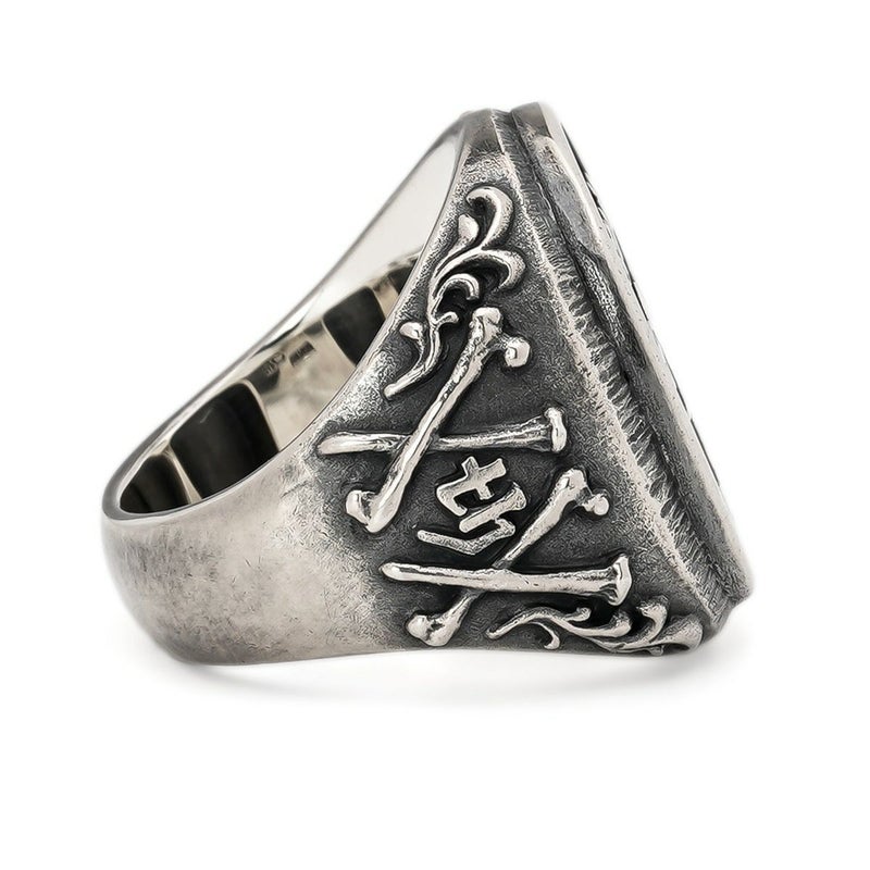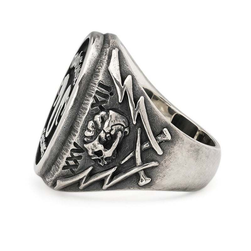 ブランド20周年を迎える記念として、中央にMCスネークロゴと左右に20を意味するXXをボーン・ライトニング・ネイルのモチーフで表現したリング。