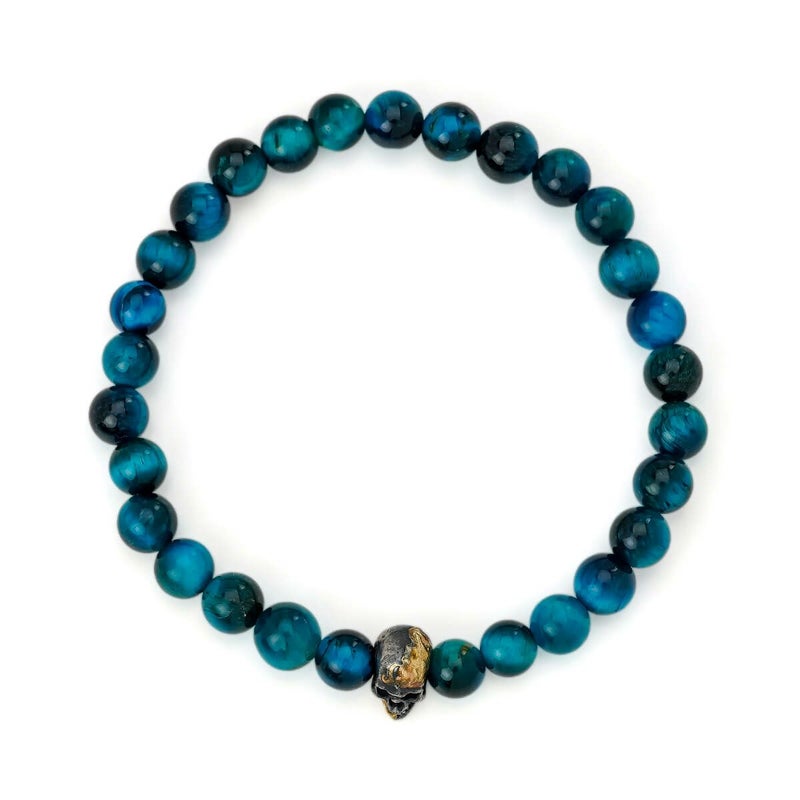 6mmサイズのブルーグリーンタイガーアイに、アクセントとなるワンポイントのスカルを組み合わせたストーンブレスレット。