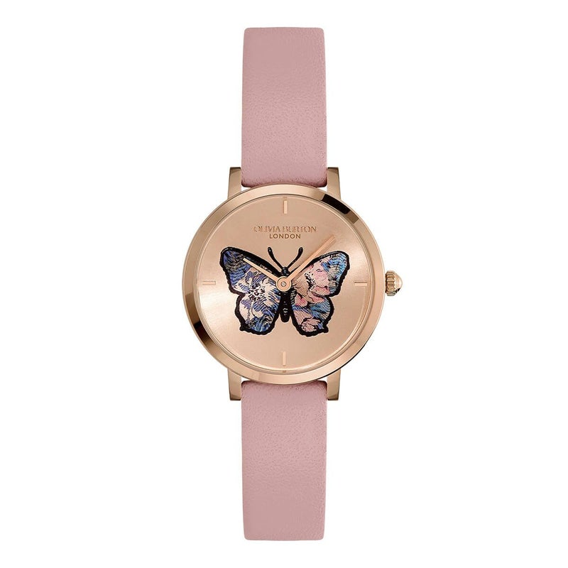 「シグネチャーバタフライ」は、その名の通りオリビア・バートンの代表的なバタフライモチーフを配した腕時計。ヴィンテージプリントからインスパイアされた美しくて優雅なフラワーパターン模様の羽が特徴で、光沢のあるサンレイダイアルの中央で圧倒的な存在感を放つ。厚さ約6.7mmの超薄型ラウンドケースとエレガントなストラップが、肌に寄り添う着用感と腕元での華やかな印象を演出する。