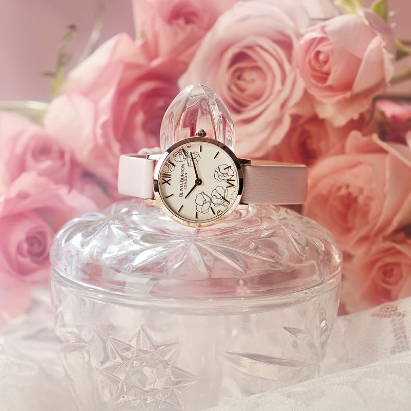 柔らかなアイボリーカラーの文字盤には、繊細なゴールドラインで描かれた抽象的な花々をあしらい、可憐でありながらも凛とした印象に。上質なメタリックの輝きが春の光を受けて、まるで花びらが風に揺れるように、手元に優雅なニュアンスを添えます。