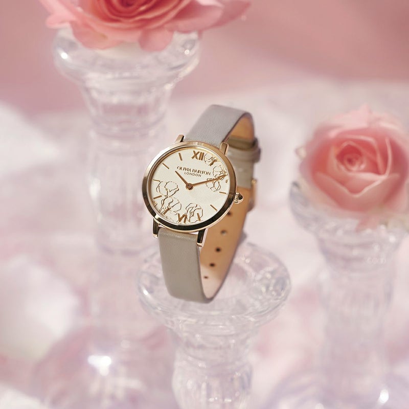 柔らかなアイボリーカラーの文字盤には、繊細なゴールドラインで描かれた抽象的な花々をあしらい、可憐でありながらも凛とした印象に。上質なメタリックの輝きが春の光を受けて、まるで花びらが風に揺れるように、手元に優雅なニュアンスを添えます。