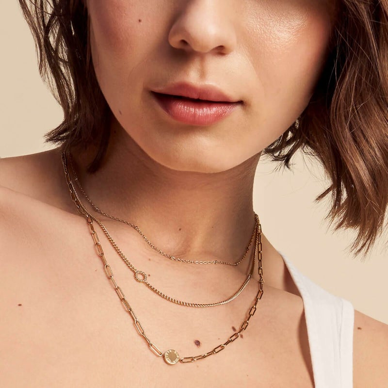 ゴールドコーティングのチェーンが3本セットになっており、重ね付けや付け替え、単品付けなど、多彩なスタイリングをシンプルに演出します。