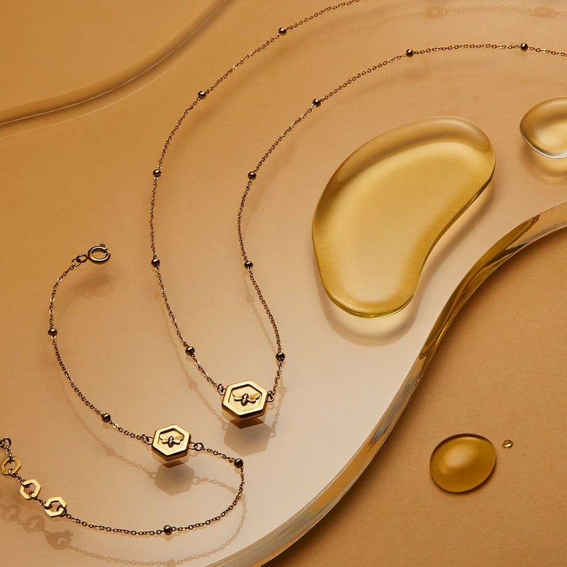 洗練されてモダンな「Minima Bee and Honeycomb(ミニマビー アンド ハニーコーム)」ペンダントネックレスは、みんなのお気に入りのミツバチを身に着ける最新の方法です。ミツバチの巣にインスパイアを受けた、ゴールドコーティングの幾何学的なペンダントには、小さなミツバチが描かれています。トレンドのビーズディテールのチェーンで仕上げられ、これを外したくないことでしょう。まだ物足りないですか?「Minima Bee and Honeycomb Bracelet(ミニマビー アンド ハニーコーム ブレスレット)」と組み合わせても素敵ですよ。