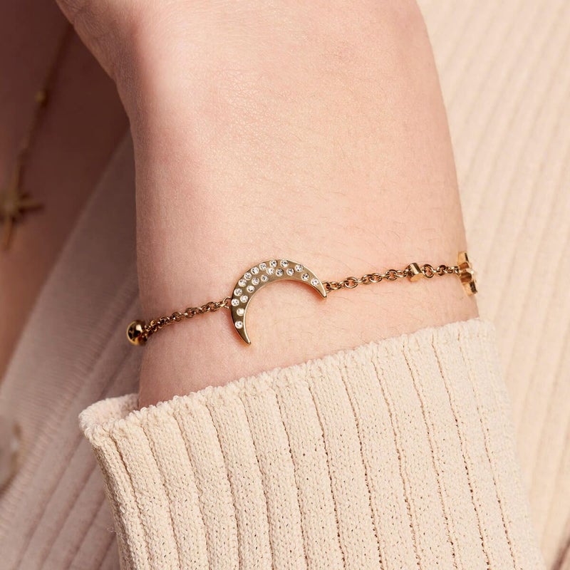セレスティアル・ノーススター&ムーン・ブレスレットは、女性的なエネルギーの象徴としての月の役割にインスパイアを受けています。繊細なチェーンに、輝くクリスタルをあしらった力強い三日月のチャームをあしらい、チェーンには北極星のディテールを施して仕上げています。月にインスパイアされたこのエレガントなスタイルは、お守りとして身につけることで、自分の内なる力を感じさせてくれるはずです。