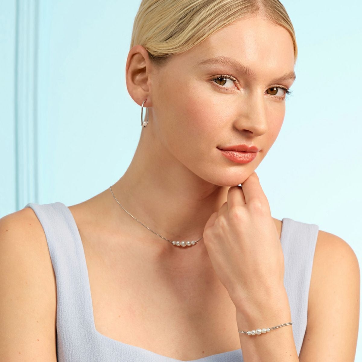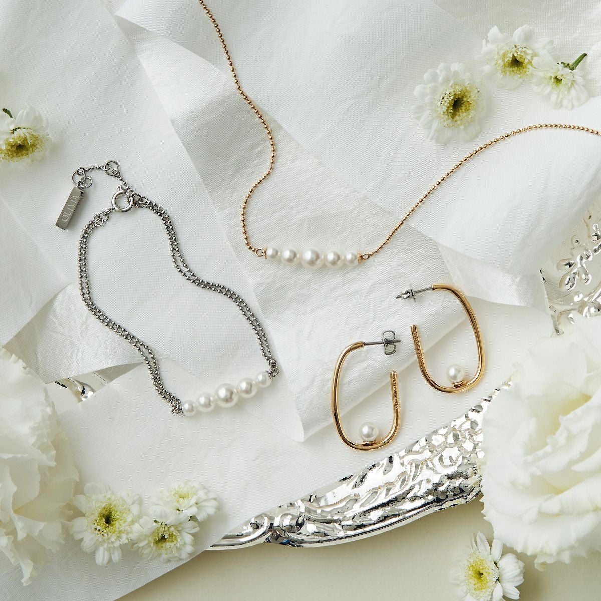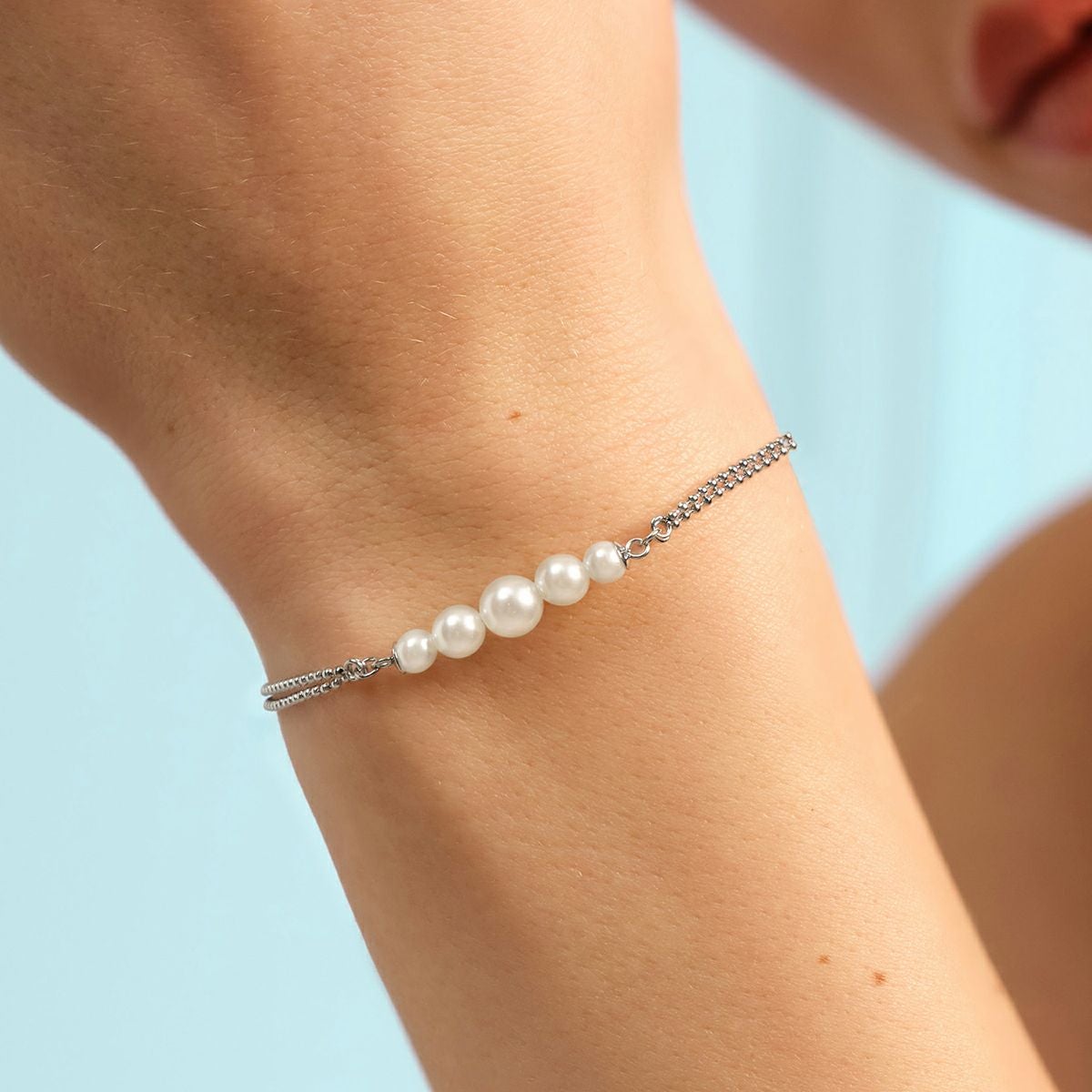オリビア・バートン クラシック - パール&ビーズ パール ダブル ロー ボール シルバー ブレスレット