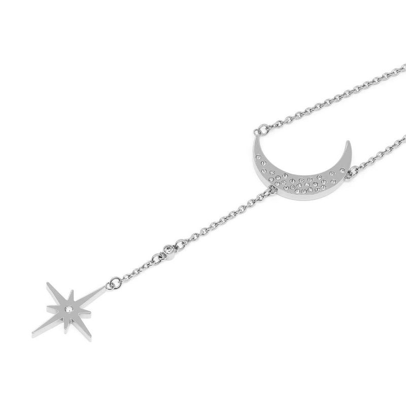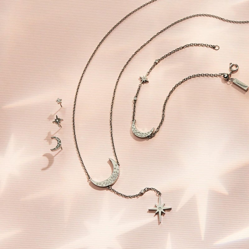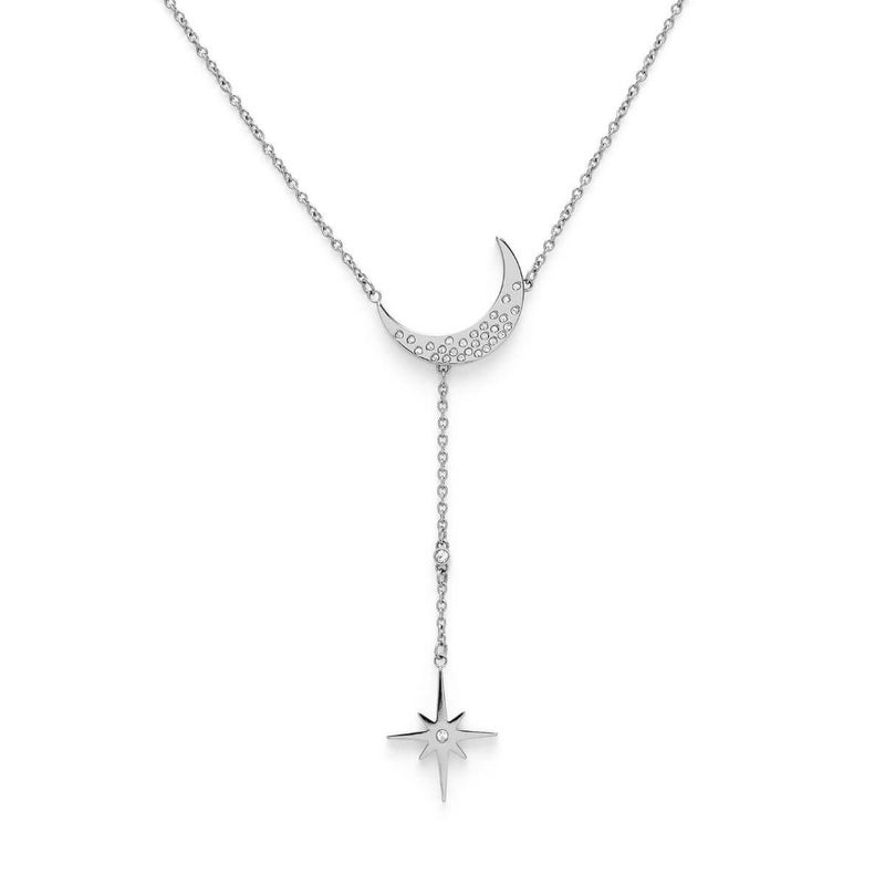 宇宙の神秘にインスパイアされた「セレスティアル ノーススター&ムーン ネックレス」です。ステンレススチールのラリエットチェーンに、クリスタルをあしらった三日月のチャームと北極星のペンダントがエレガントな印象を与えてくれます。月をモチーフにしたこのスタイルは、私たちを取り巻く世界とのつながりを示すお守りとして身につけましょう。