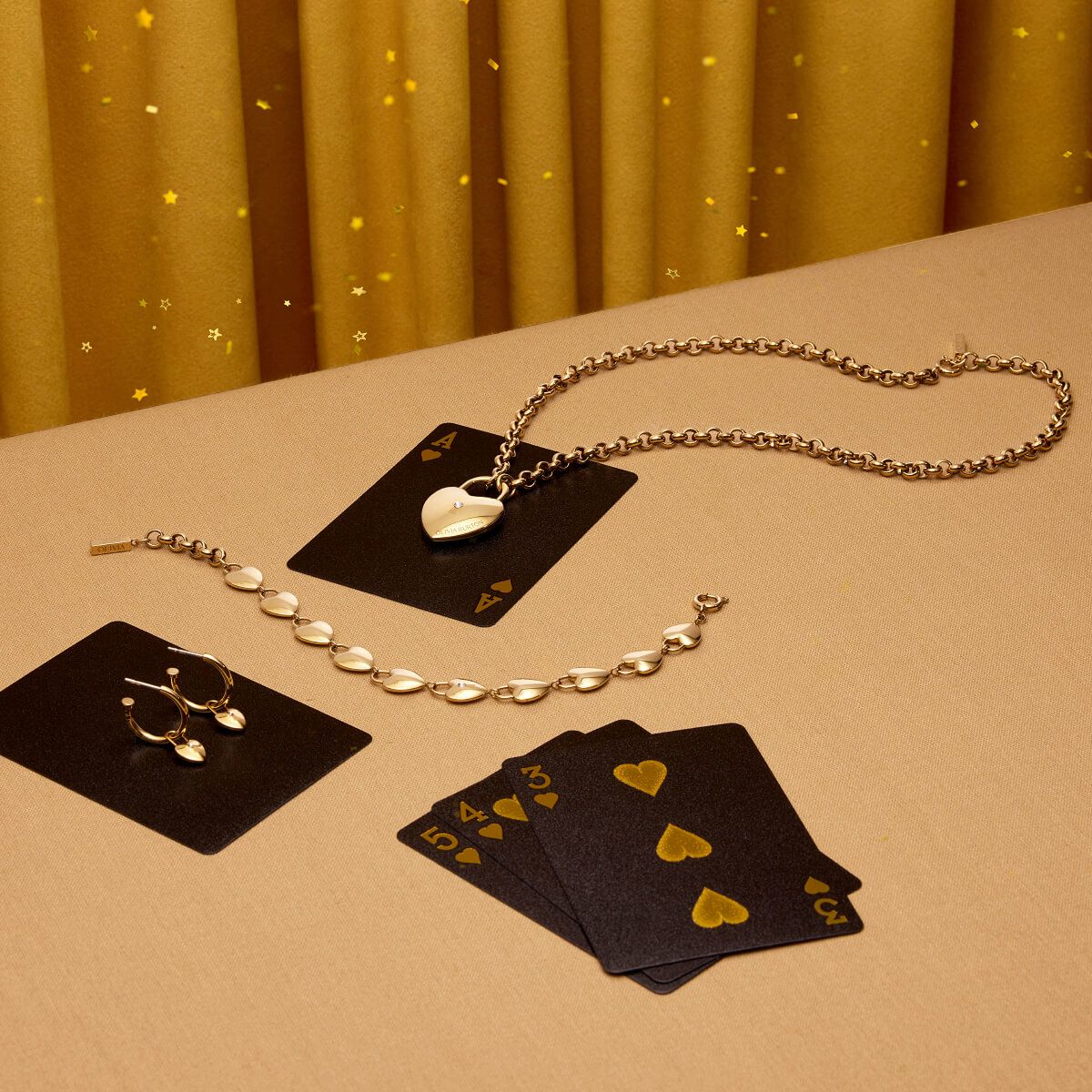 シルバー、ゴールド、ローズゴールドの3色展開で、繊細なハートチャームと中央に輝くクリスタルがセットされ、特別な瞬間を一層ロマンティックに演出します。