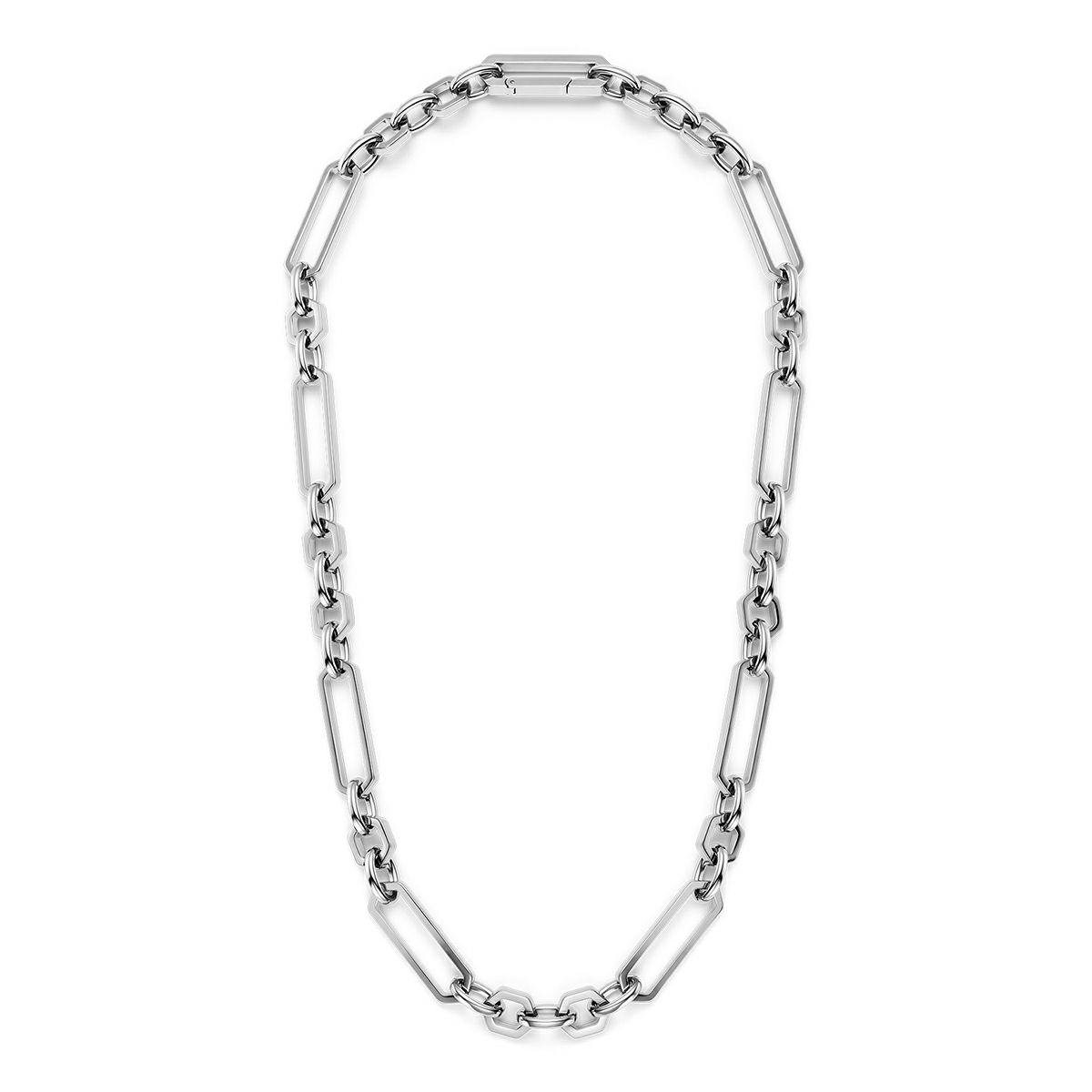 重厚感のあるネックレスは、着けるだけでコーディネートがキリッと締まるステートメントアイテムです。インビジブルクラスプ(隠し留め具)を採用し、見た目はモードでも着脱は簡単で、機能性とデザイン性を両立しています。