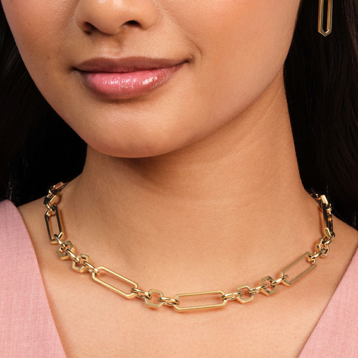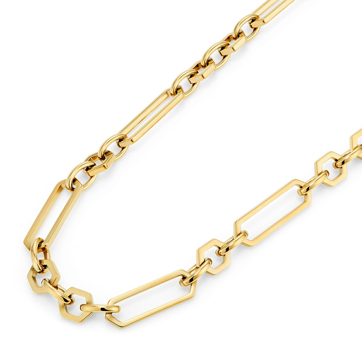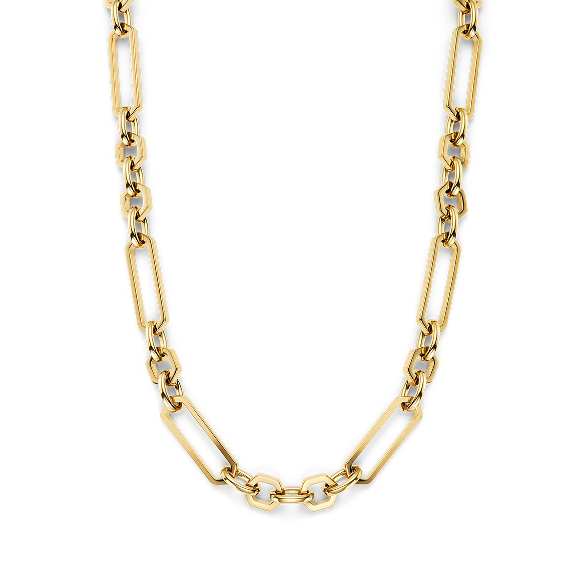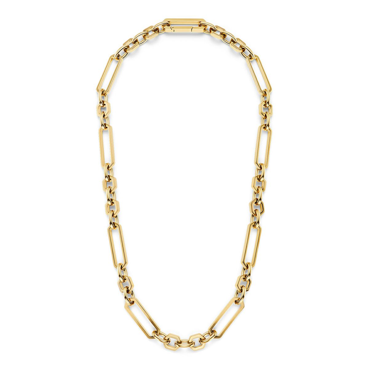 重厚感のあるネックレスは、着けるだけでコーディネートがキリッと締まるステートメントアイテムです。インビジブルクラスプ(隠し留め具)を採用し、見た目はモードでも着脱は簡単で、機能性とデザイン性を両立しています。