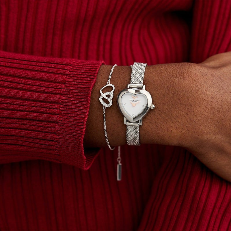 腕元の小さな宝物。ヴィンテージ風のハート型の小さなケースに、マザーオブパールの文字盤と小さなミツバチのモチーフを閉じ込めて、シルバーカラーのメッシュベルトを合わせました。「運命の愛(Mean to be)」と「ミツバチ(Bee)」の意味を込めた新作コレクションです。バレンタインやホワイトデーのギフトとしても、自分へのご褒美としても、「大切にしています」というメッセージを実感できるアイテムです。