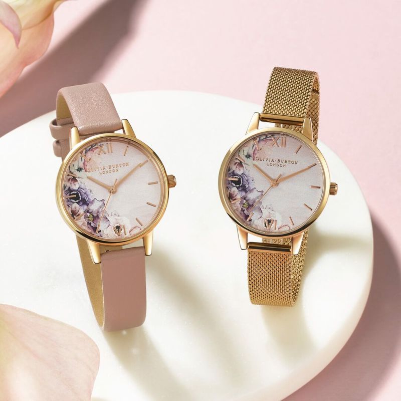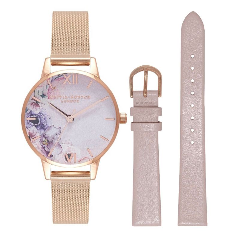オリビア・バートン ウォーターカラーフローラル - ミディ ローズゴールドメッシュ & レザー ビーガン ローズ サンド