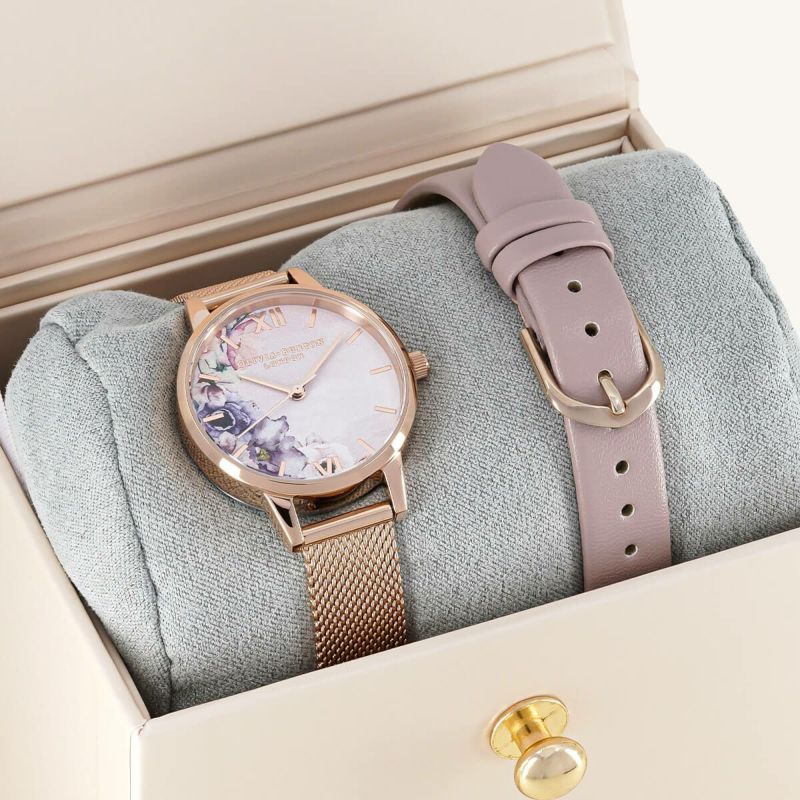 水彩画で表現されたパープルやピンクのフラワープリントが施され、華やかでありながらも落ち着いた上品な印象を与える腕時計。ローズゴールドメッシュと、くすみがかったサンドピンクカラーのビーガンレザーの2本セット。
