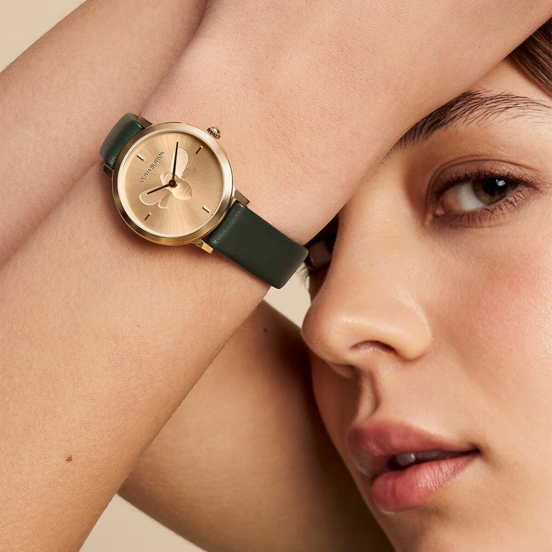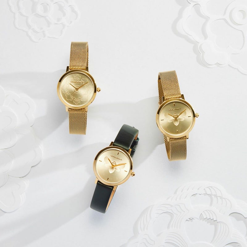 植物から動物をモチーフにしたシグネチャーコレクションは、私たちを取り巻く世界からインスピレーションを得ています。この「シグネチャー ビーウォッチ」は、28mmのゴールドサンレイダイヤルに複雑な蜂のモチーフが描かれています。グリーンのレザーストラップと薄型のケースを組み合わせた、繊細で重ね付けしやすいデザインに仕上がっています。