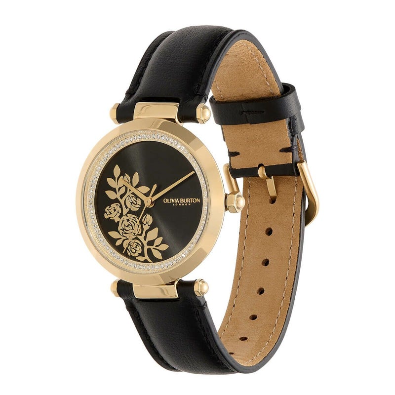 オリビア・バートン シグネチャー - 34mm フローラル Tバー ゴールド & ブラック レザー ストラップ ウォッチ