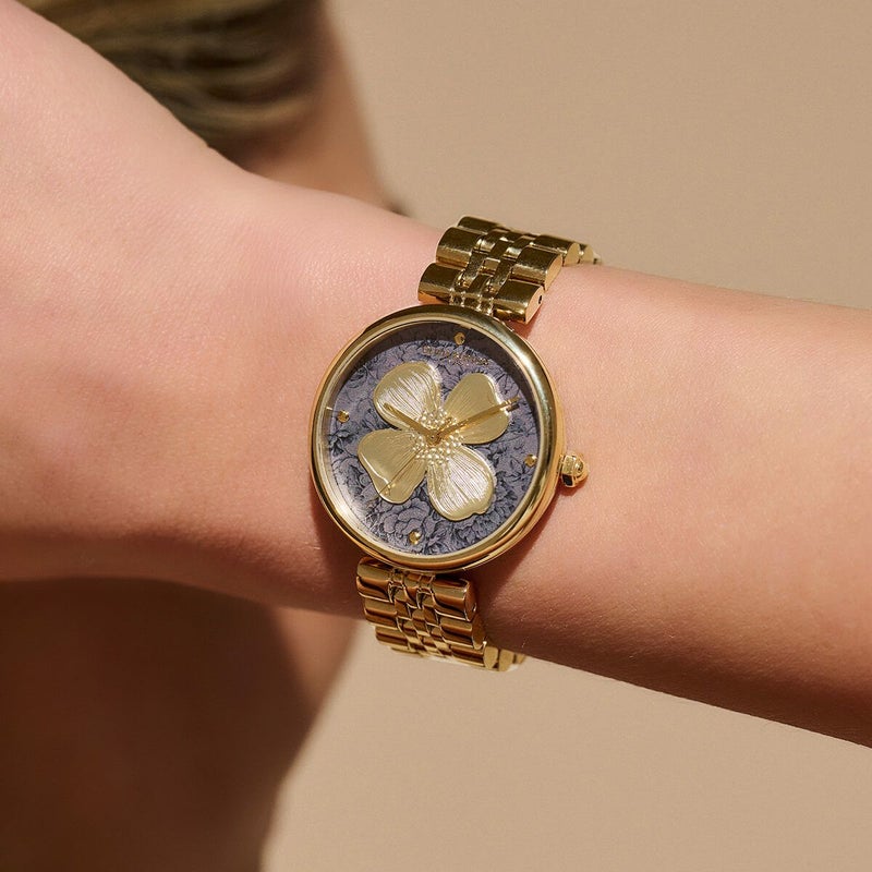 イギリスの長閑な田園風景からインスパイアを得てデザインされた「ドッグウッド」。シンプルな36mm径のラウンドケースに、繊細なフラワープリントダイアルをセット。ダイアル中央には、美しいドッグウッド(ハナミズキ)の花を立体的に表現したモチーフを配置。花びら1枚1枚に細かなラインを施して、より立体感を演出しています。愛らしいドットインデックスがデザインに魅力を加え、Tバー形状のラグがデザインのアクセントに。細部にまで拘りの詰まった1本となっています。