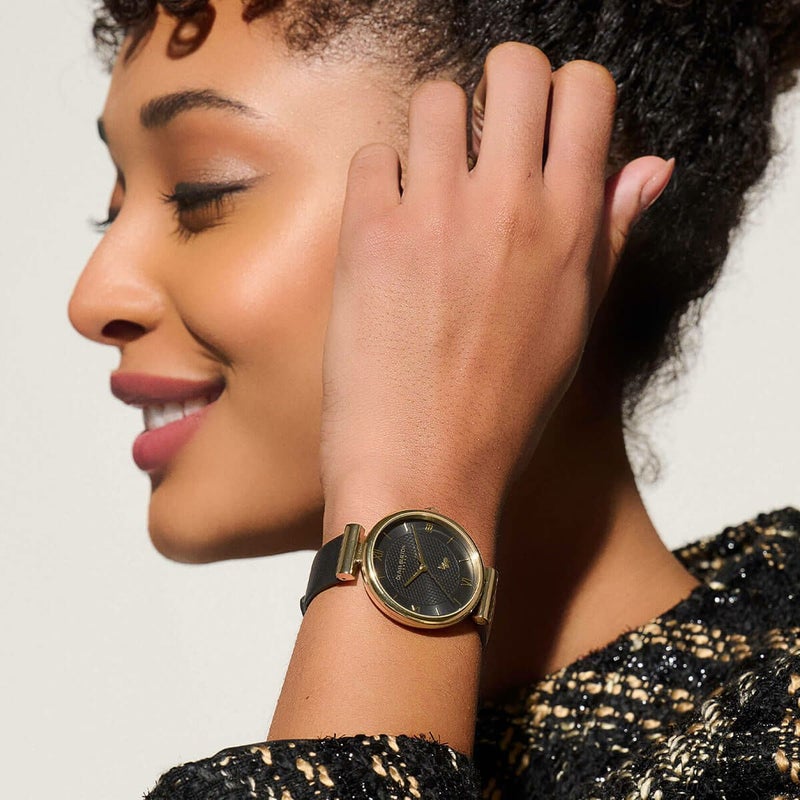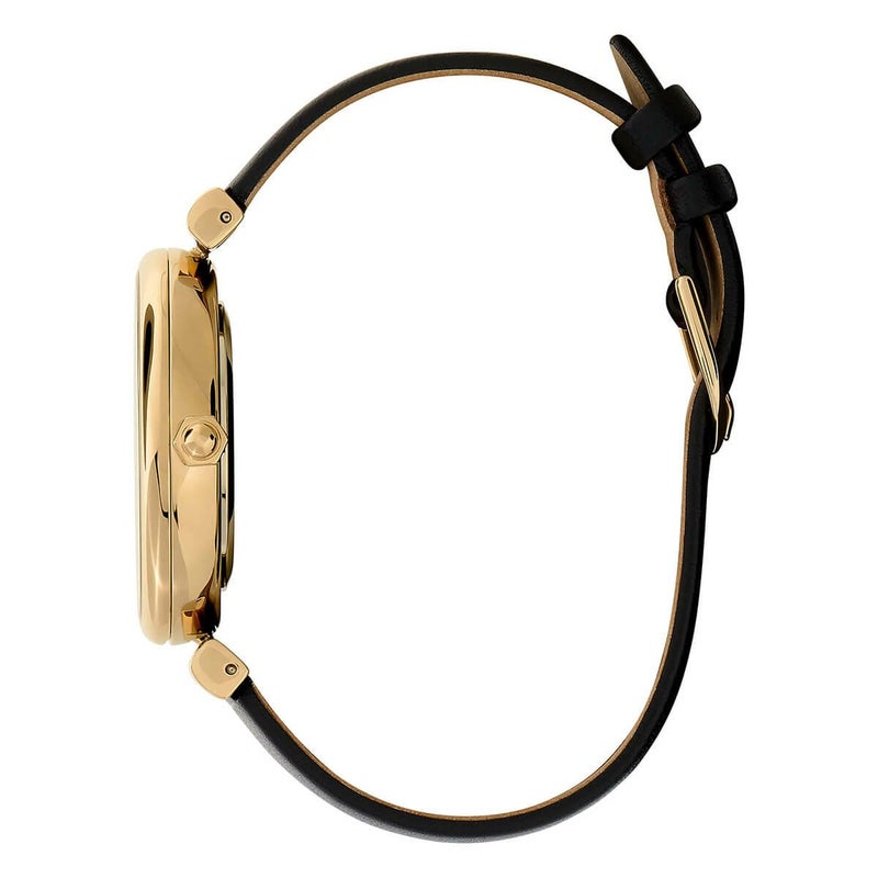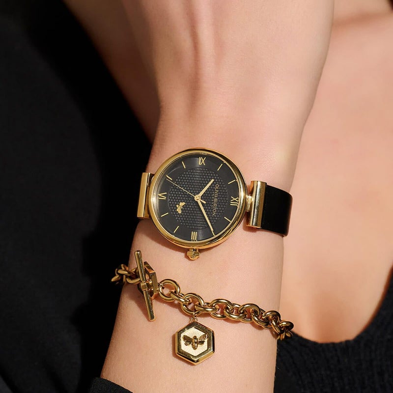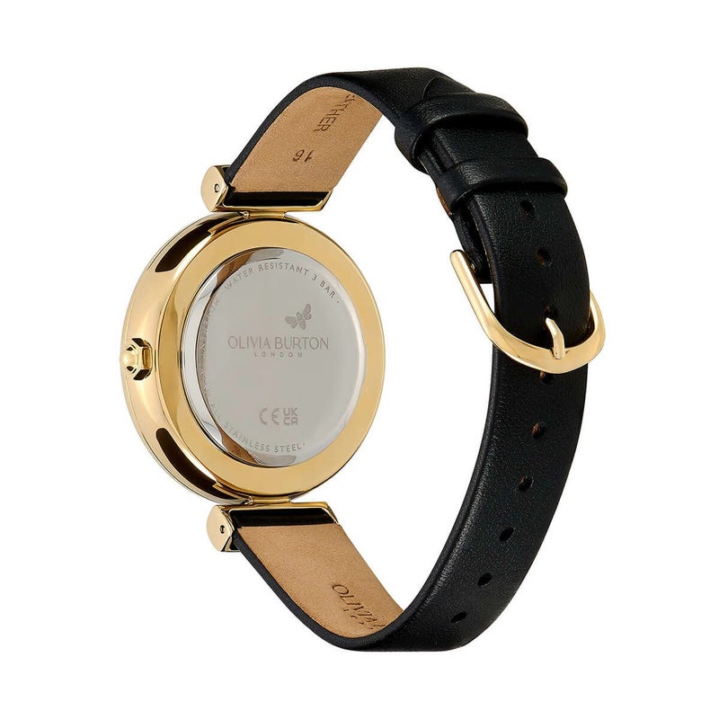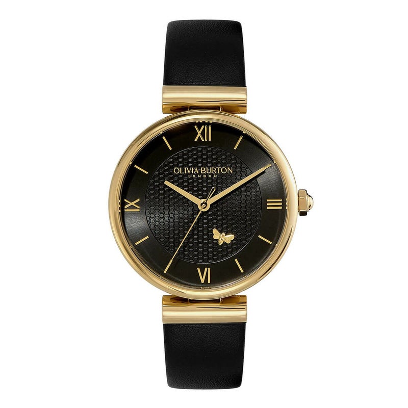オリビア・バートン シグネチャー - 36mm ミニマ ビー T バー ゴールド & ブラック レザー ストラップ ウォッチ
