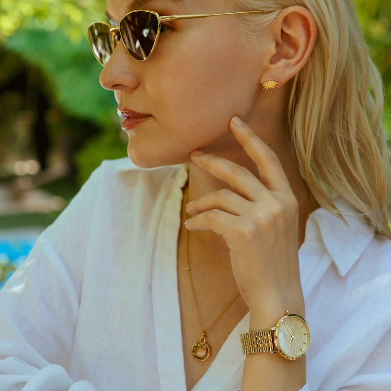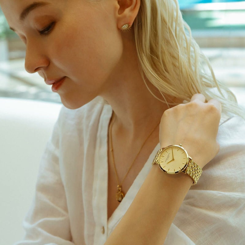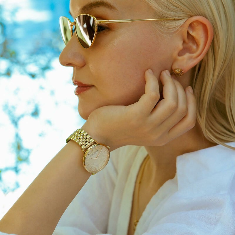 「ラディアントサン」は、光り輝く太陽からインスピレーションを得たデザインが特徴。ダイアルにはキラキラとしたメタリックなウェーブ柄が施され、細やかなテクスチャーが波打つ光線表現し、絶妙なグラデーション効果を演出している。スリムな35mmケースとクラシックな5リンクブレスレットストラップにより、遊び心を持ちながらも洗練されたコンテンポラリースタイルが完成した。