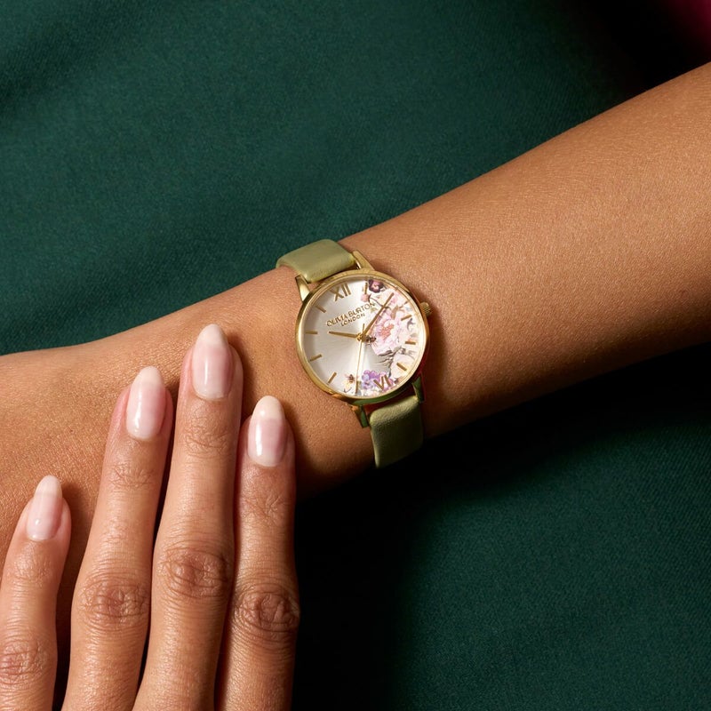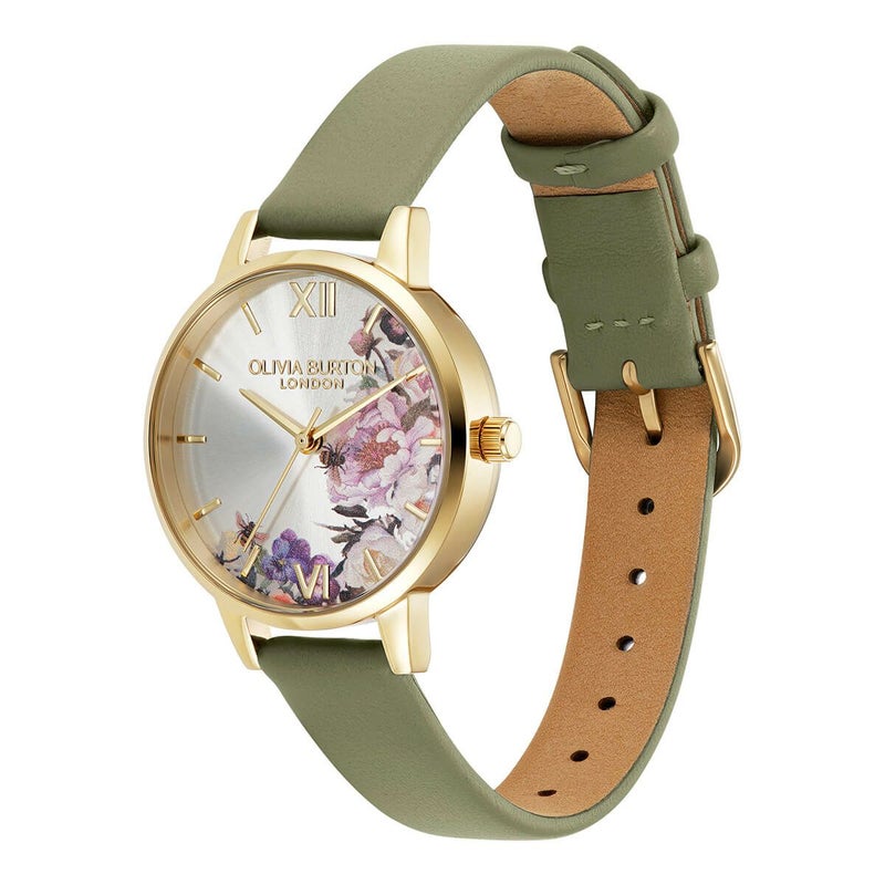 オリビア・バートン シグネチャー - 30mm イラストレイテッド フローラル ゴールド & セージグリーン レザーストラップ ウォッチ