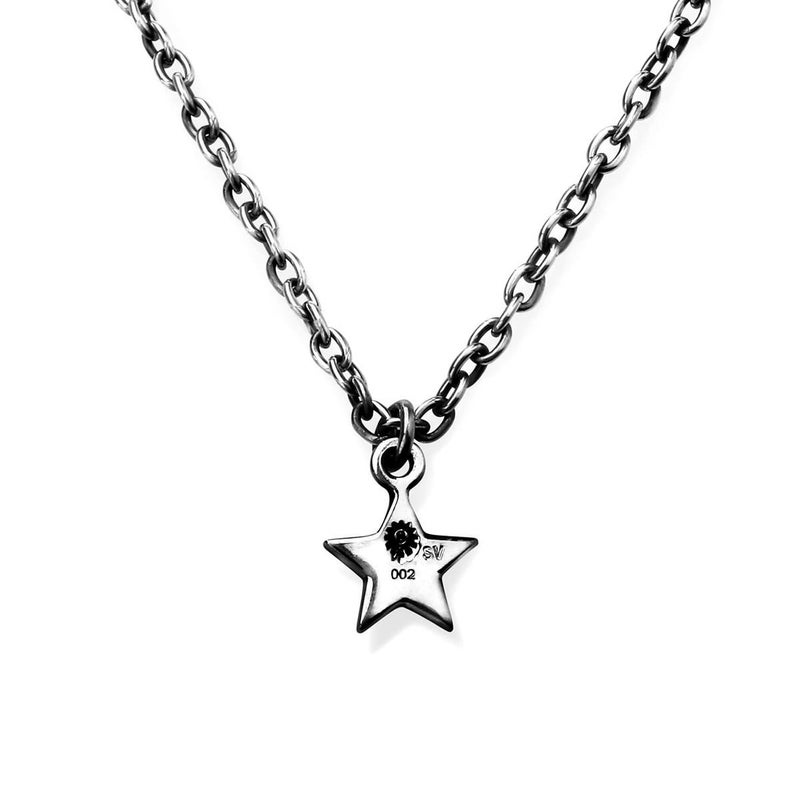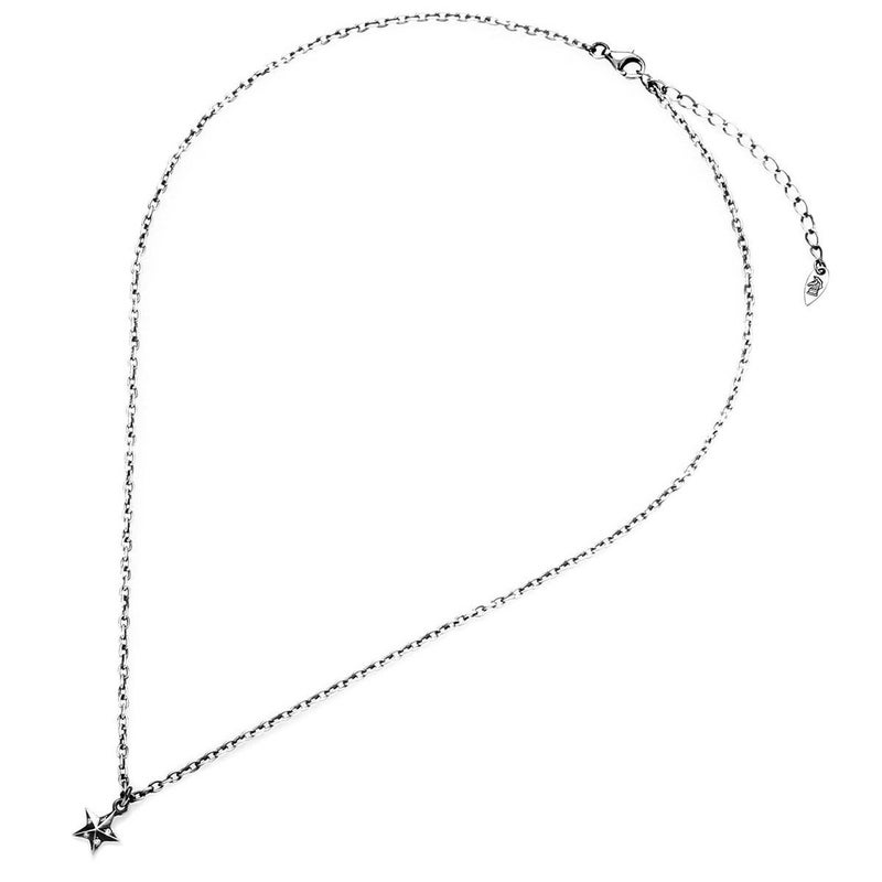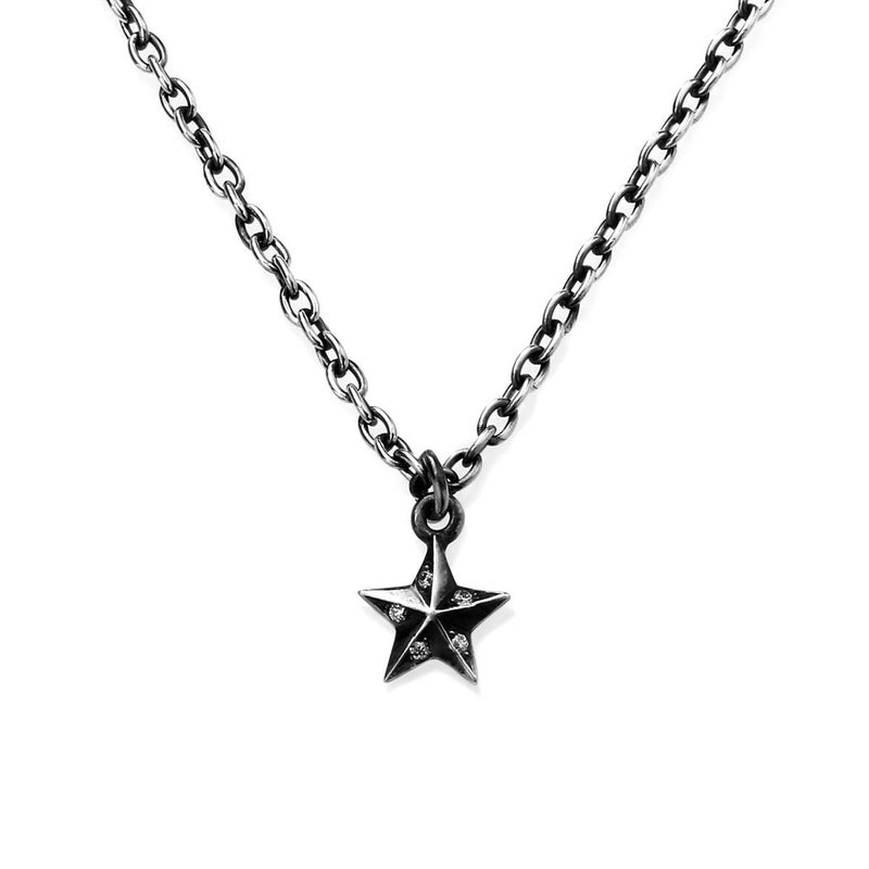 小さめサイズ感のスターネックレス。燻し加工を効かせ、ダイヤモンドの輝きを強調。ソリッドなディティールにロックな雰囲気を纏う。