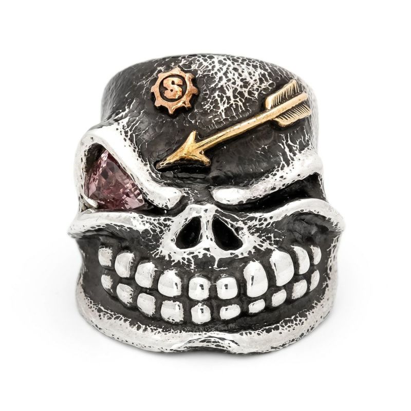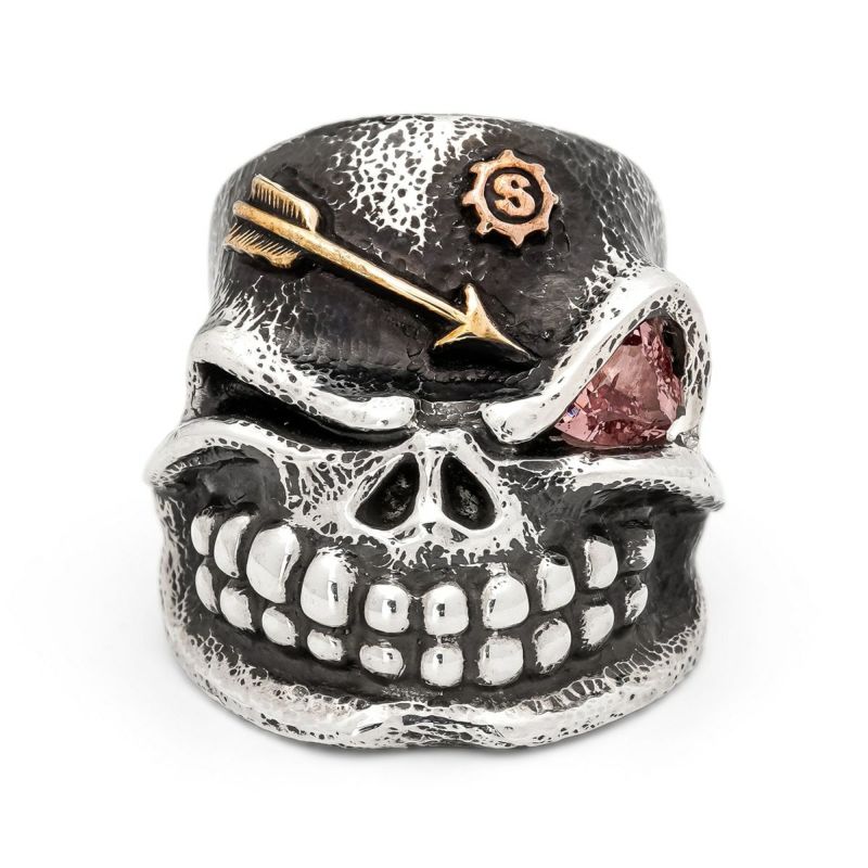こちらはブラス素材のアンティークのアローパーツとコパー素材のSギアロゴを取り付け、そしてジェムジュエラーが原石から削り出したモルガナイトがセッティングされた究極の一品です。