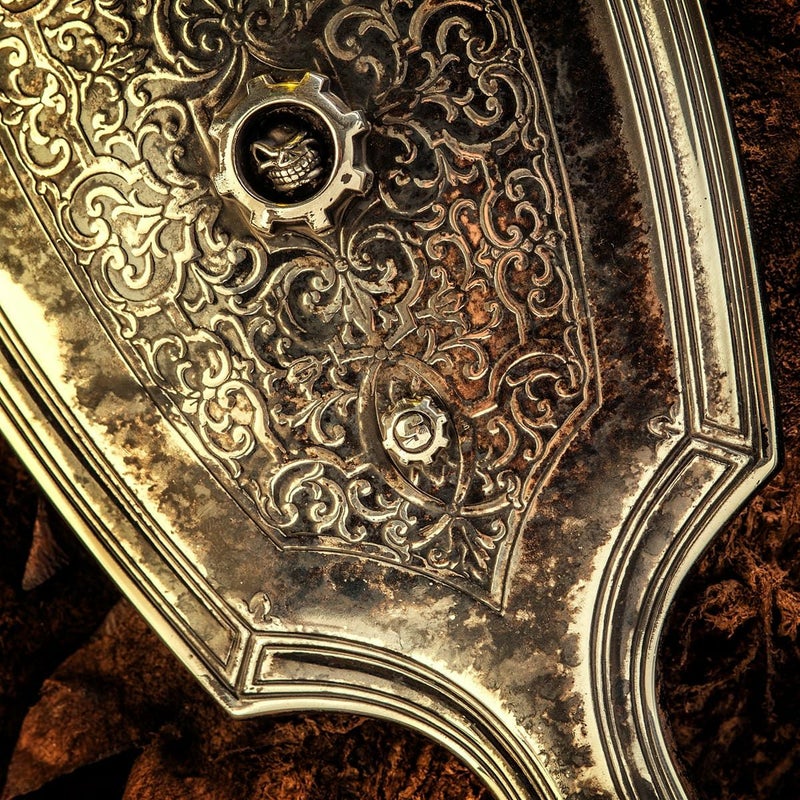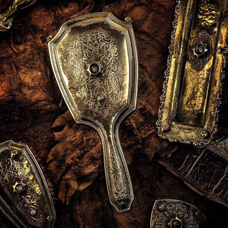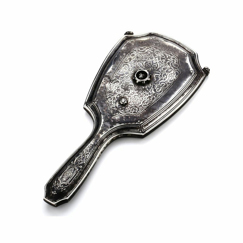 1915年頃に製造されたティファニーのシルバー製ハンドミラー。ヴィンテージマーケットで入手、ティファニーが持つ造形の美しさを損なうことなく、スターリンギアオリジナルのアイコンでるタイニースカル・スカルギア・Sギアロゴが施されている。