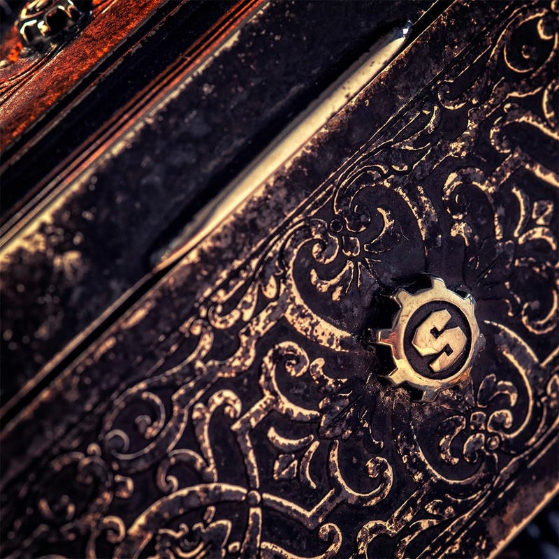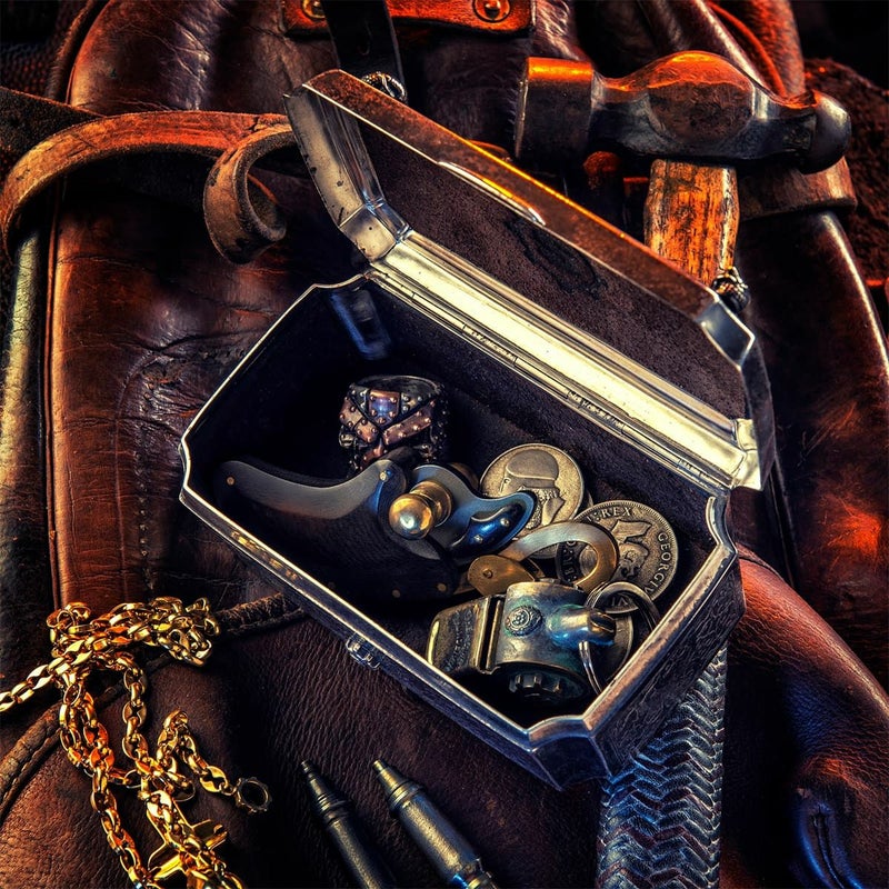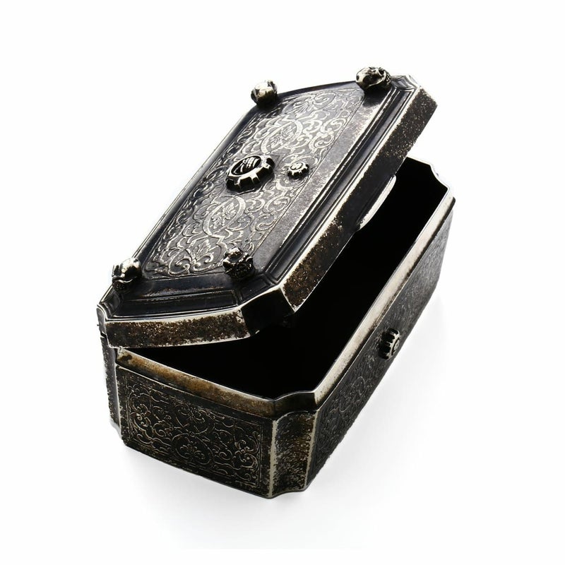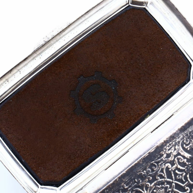 1920年頃に製造されたとても大きなティファニーのシルバー製スクエアドレッサーボックス。ヴィンテージマーケットで入手、ティファニーが持つ造形の美しさを損なうことなく、スターリンギアオリジナルのアイコンでるタイニースカル・スカルギア・Sギアロゴが施されている。また蓋裏にはレザーが敷かれている。