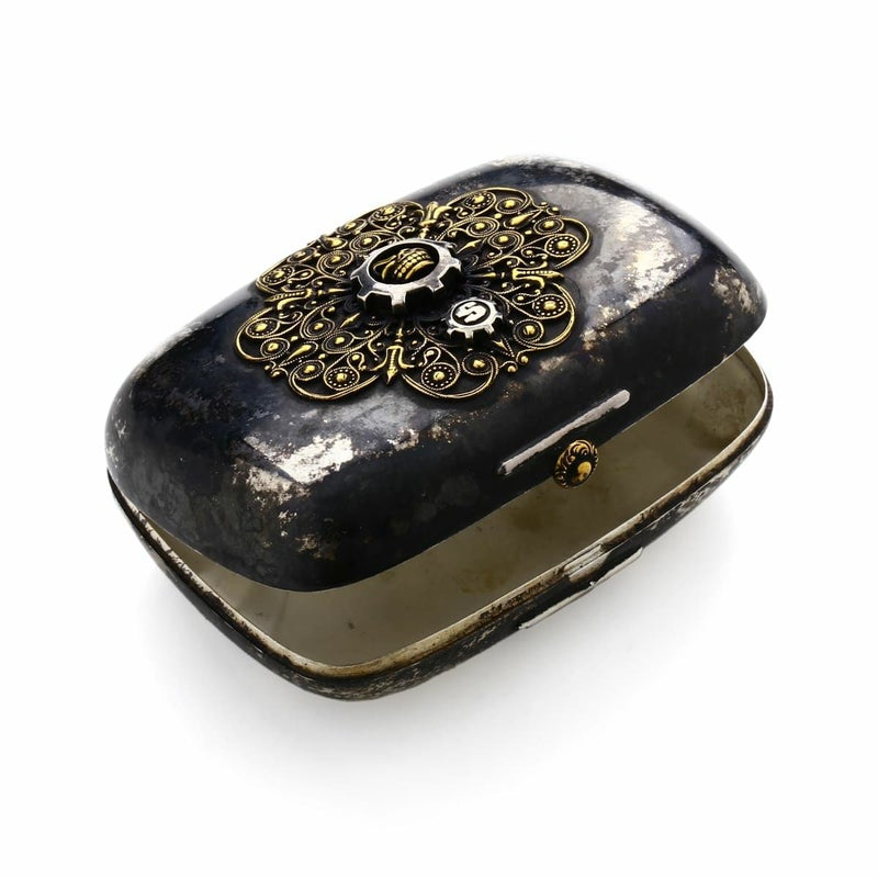 1910年頃に製造されたティファニーのシルバー製トラベルソープボックス。ヴィンテージマーケットで入手、ティファニーが持つ造形の美しさを損なうことなく、異なるアンティークパーツをアッセンブリし、スターリンギアのアイコンであるスカルギア・そしてSギアロゴが施されている。