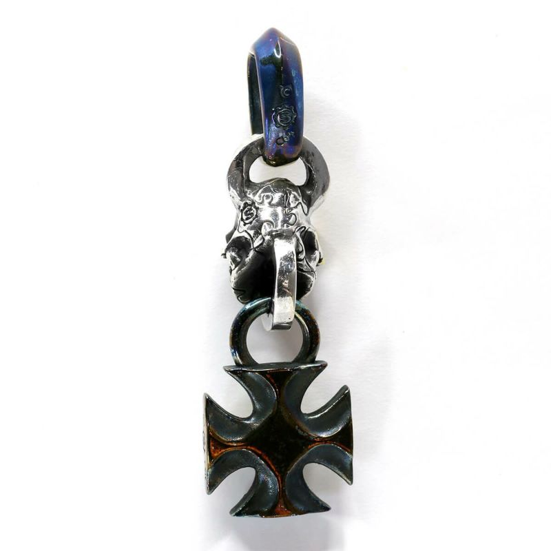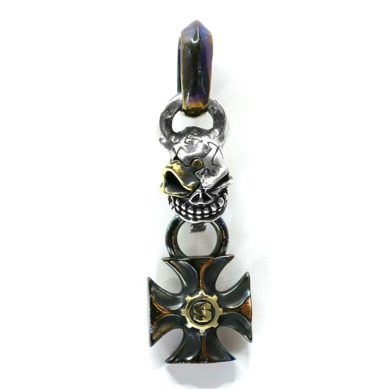 片目のパーツとクロスのセンターにあるSロゴを同素材で合わせたコンビネーションペンダント。