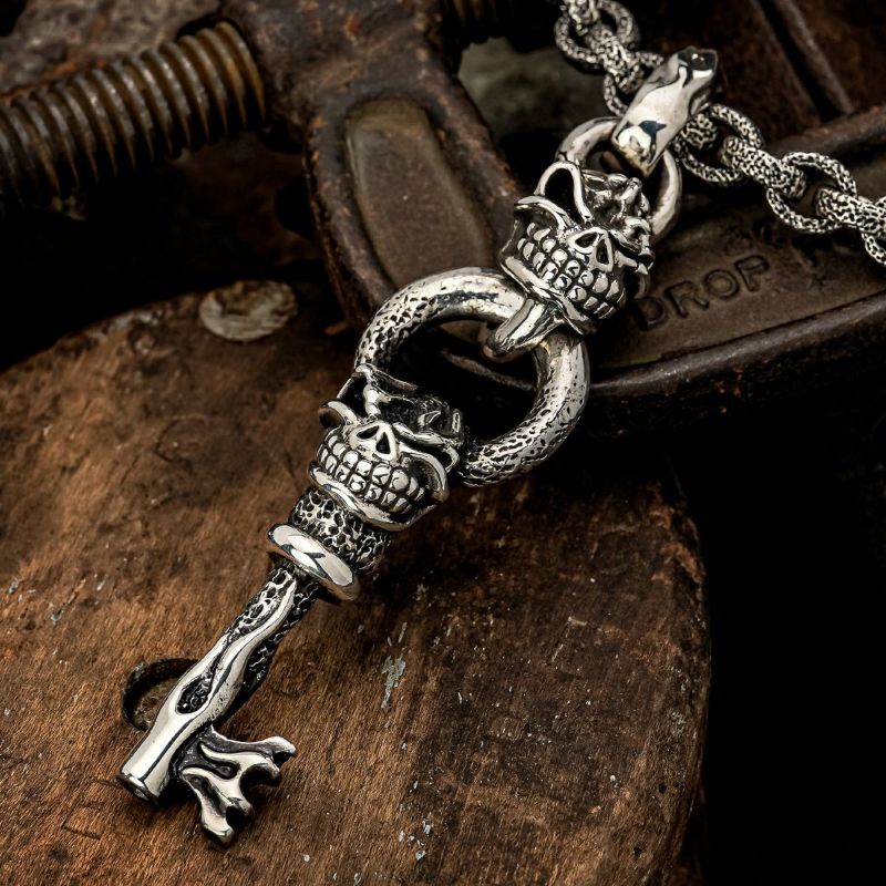 最も人気の高いプレーミングスケルトンキーペンダントに新作のマイクロスカルステッチーズリンクを組み合わせたカスタムのペンダント。