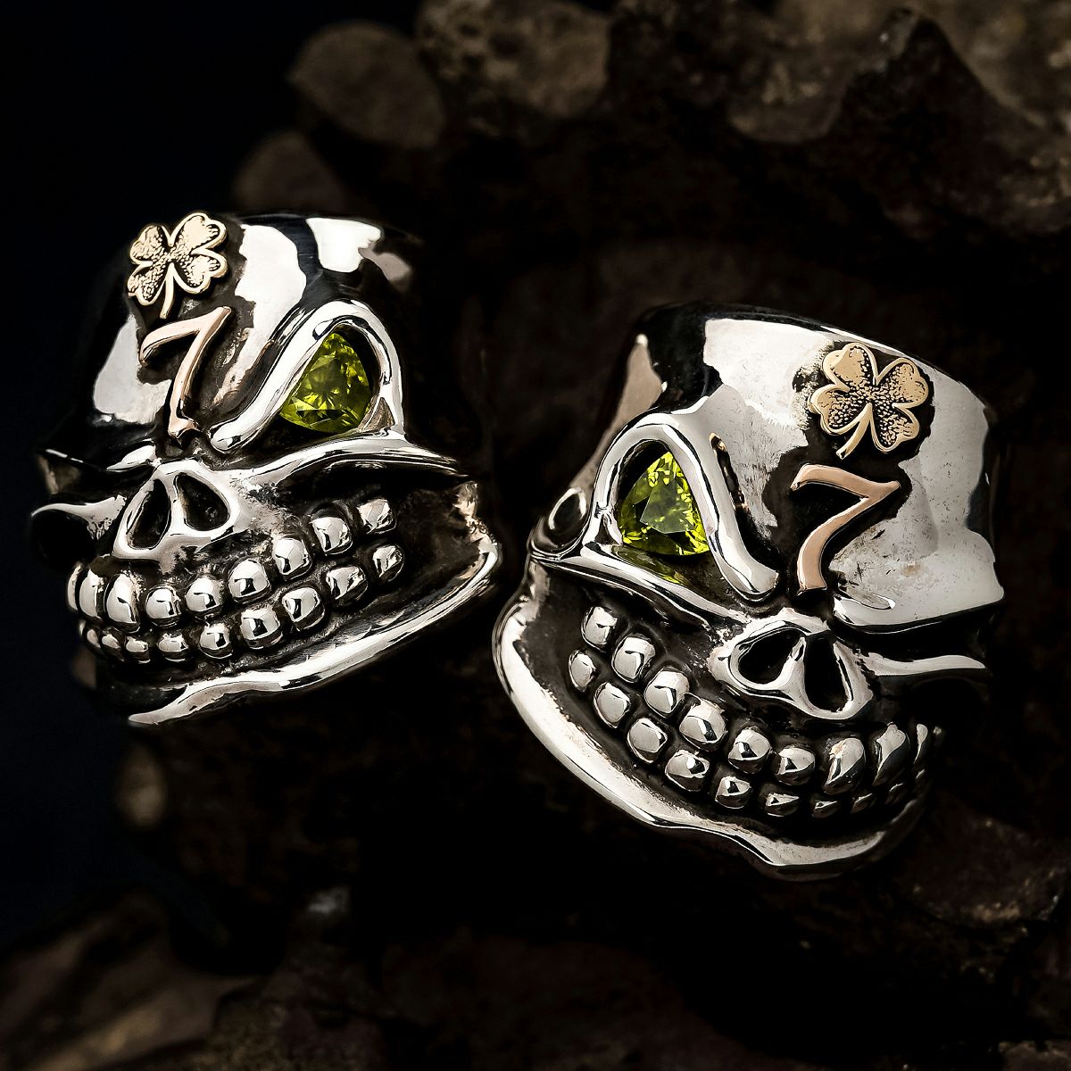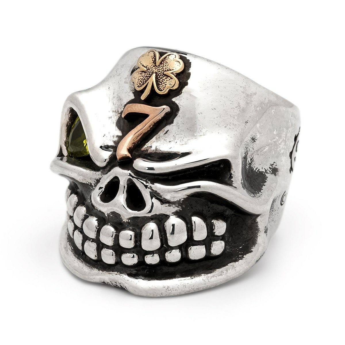 こちらはブラス素材のアンティークの四つ葉のクローバーパーツとコパー素材の7ロゴを取り付け、そしてジェムジュエラーが原石から削り出したペリドットがセッティングされた究極の一品です。