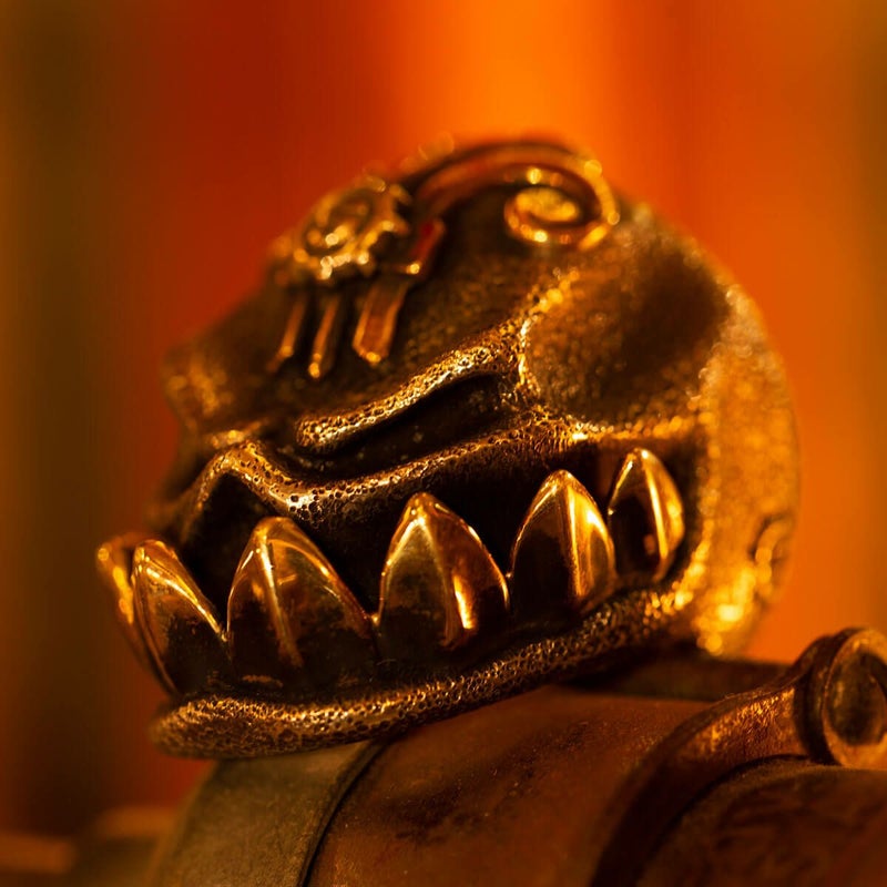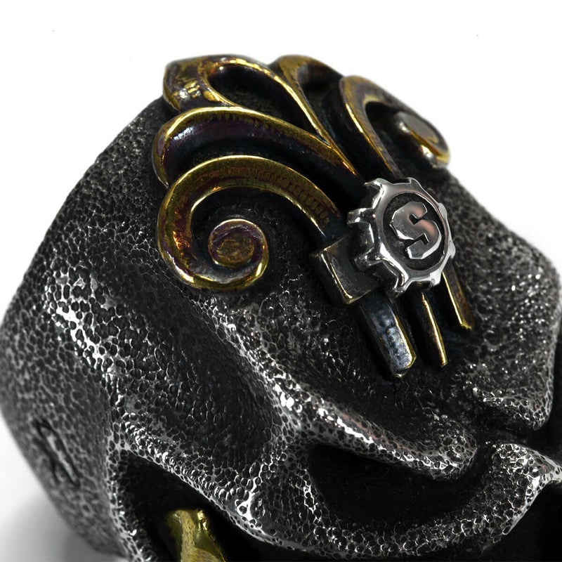 原型はプレーンでオデコと口元には何もない状態で、そこにシブラスで作られたサウトゥース(鋸歯)とパーツをアタッチし、額には大きなアンティークパーツを施した贅沢な一品。ハンドテクスチャーは鋳造後に手作業で施している究極の1点物です。