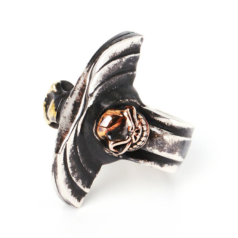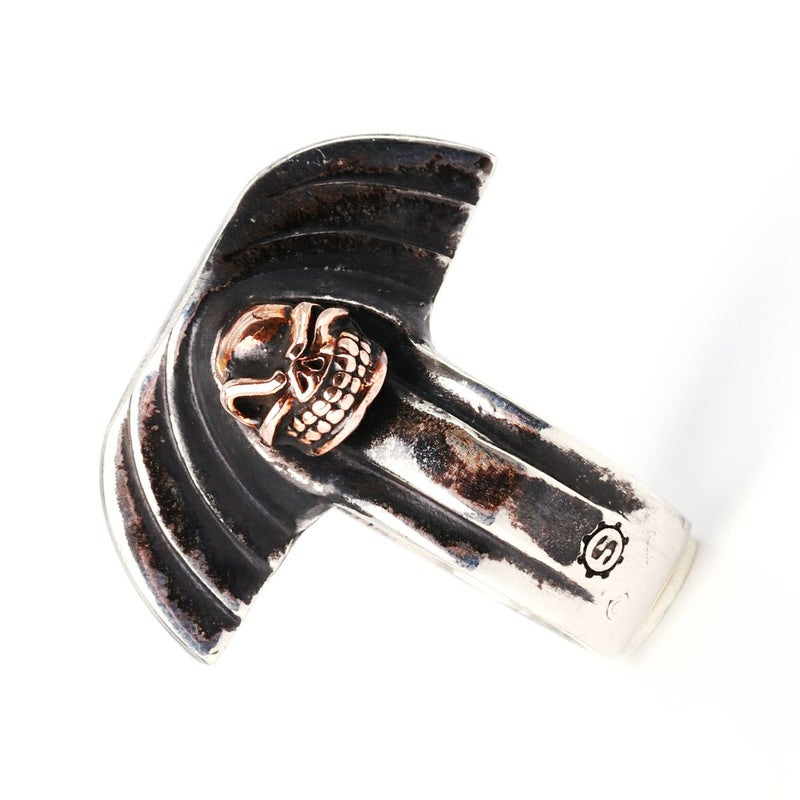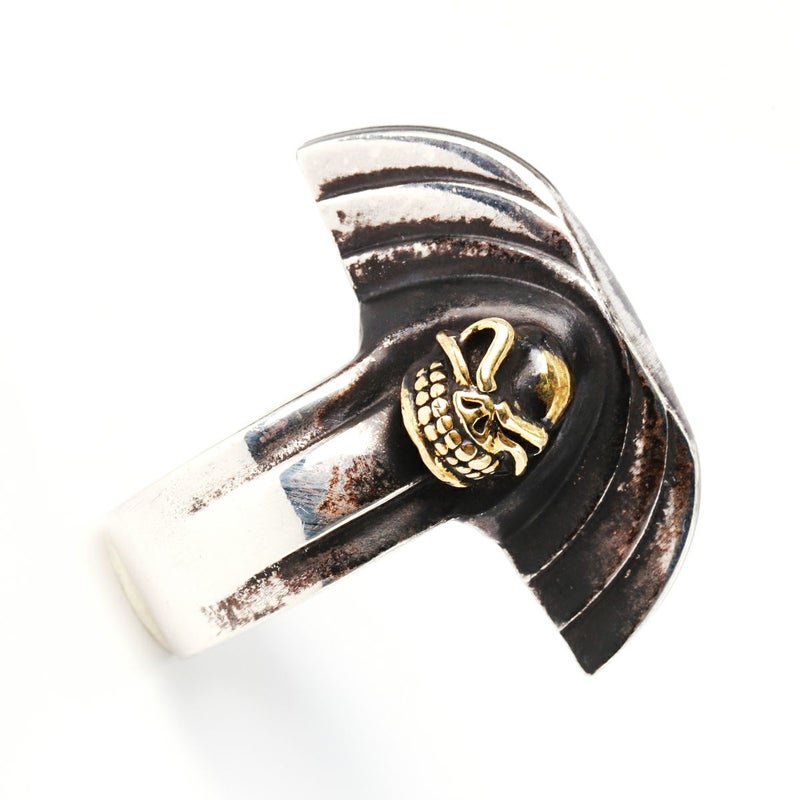 昔のラジオやドアなどにつけられていたつまみからインスパイアされたリング。フェイス系のリングとは違い、両サイドにあるスカルがさり気無い演出をしている。
