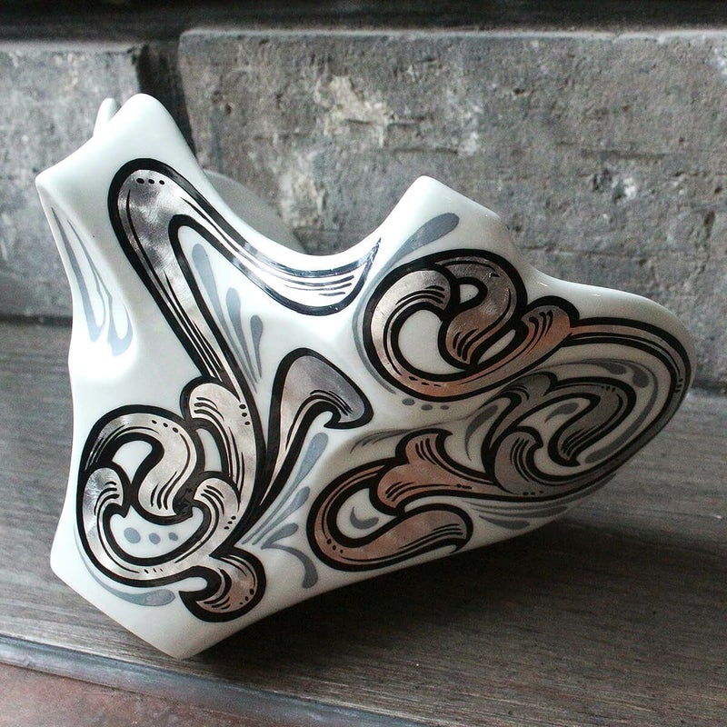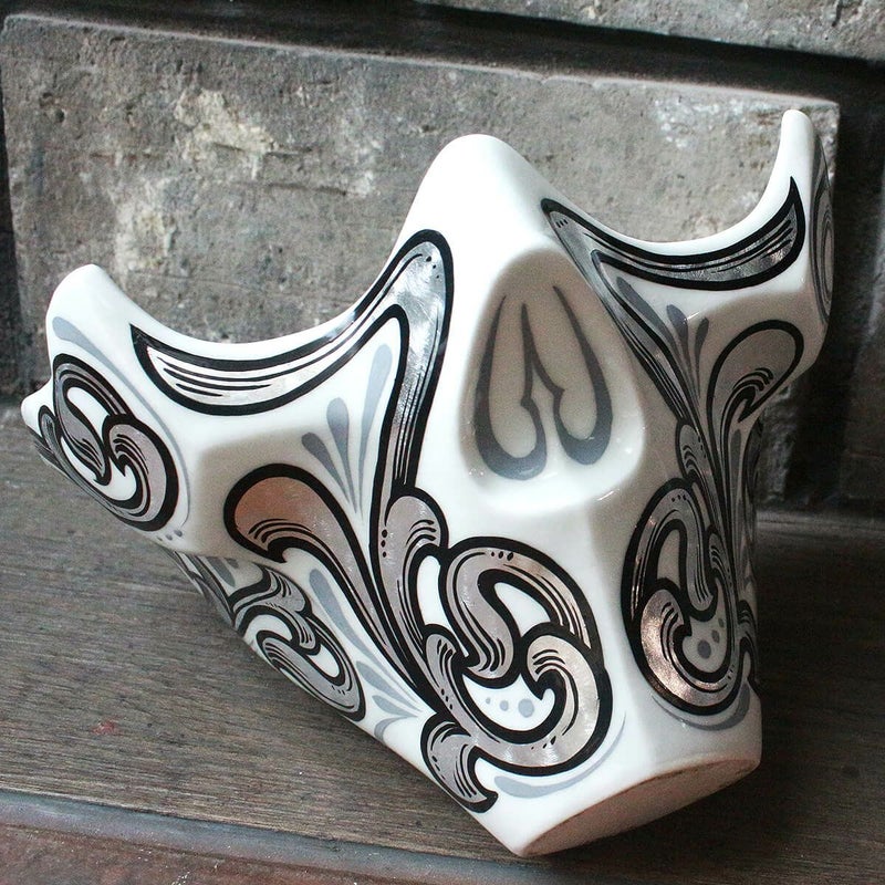 武家の教養として発展した日本の総合芸術、茶の湯。その系譜を汲んだ懐石の器として発展した酒器。茶の湯と戦国武将と工芸、特に焼物との密接な繋がりから必然的に導いた頬鎧のフォルムをした磁器盃です。人型でありながら戦国武将特有のどっしりしたオーソドックスな形からは離れ、異端児のようなカリスマ性、モードで近未来的な人型にするため顎の部分をより細くし、鼻部分もスマートにしました。凛とした豪傑を表現しました。