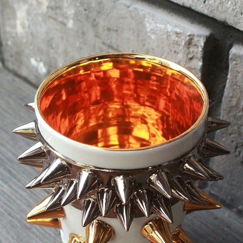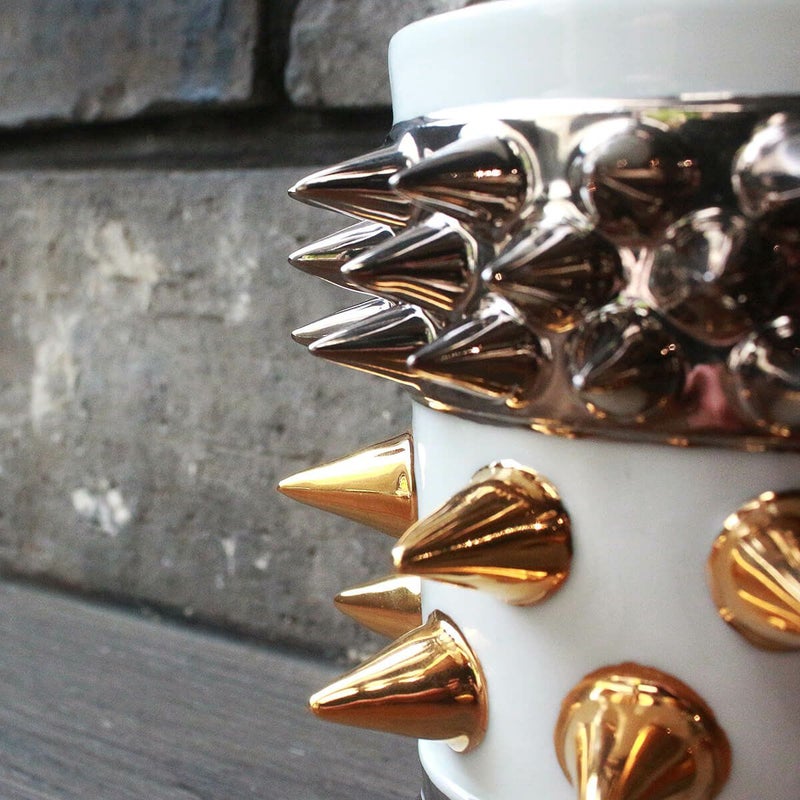 千利休へのリスペクトを込めて反利休、反侘び寂びの器です。用の美と真逆にある刺激的な視覚、触覚、持つことを拒むような形状。反骨心の象徴的なモチーフであるスタッズを用いてモノに内在する力を可視化したパンクロックな器です。