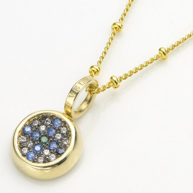 コインの中に石を用いたクロスをデザインしています。小振りながらも鮮やかなカラーストーンが胸元を華やかに演出します。