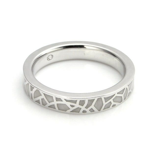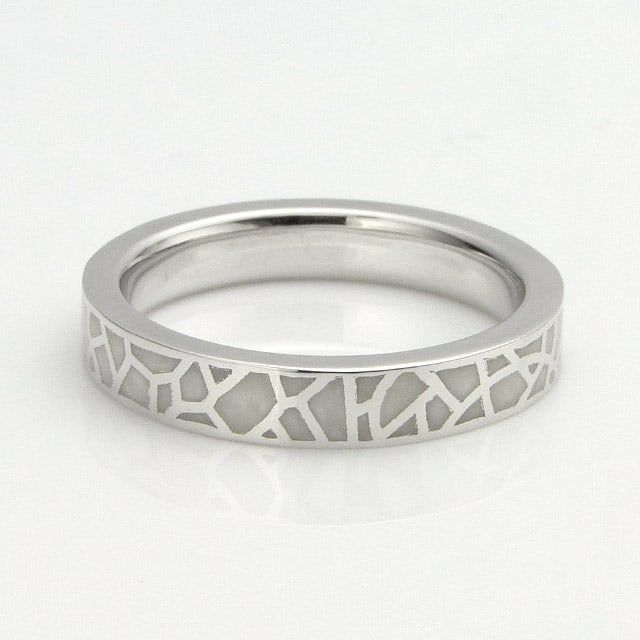 ガウディの建造物に多用されるモザイク柄をリングに落とし込みました。モザイク部分に用いているエポキシ樹脂は特別な調合をする事で独特な広がりを持つ色に仕上げています。