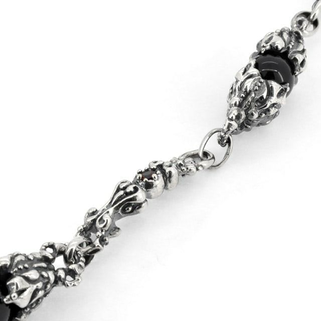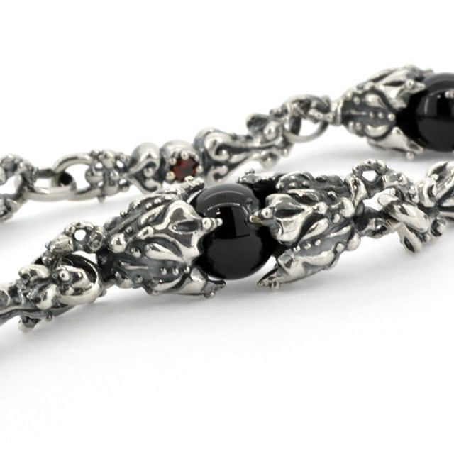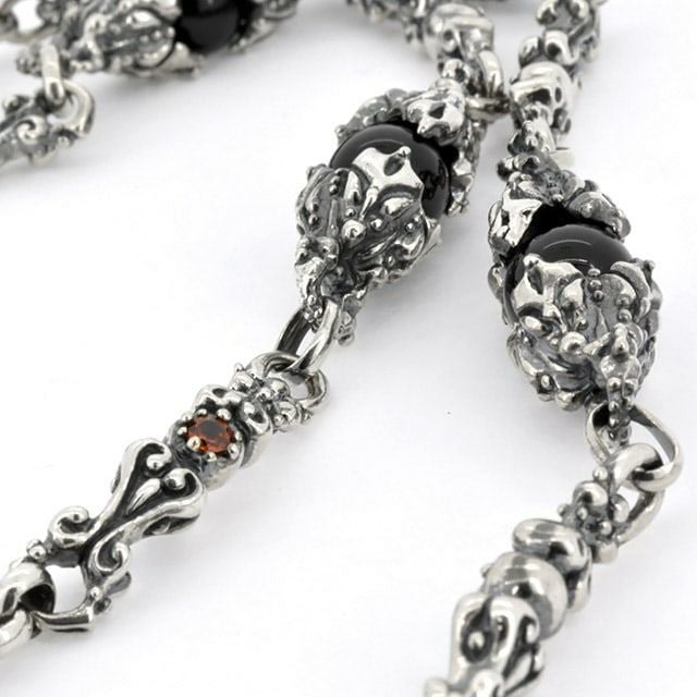 オニキスの珠をシルバーで挟み込み、間のパーツには石の入った贅沢なネックレス。ガーネット・アメジスト・スモーキークォーツの3種類から選択できます