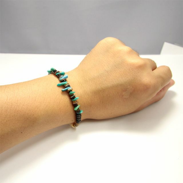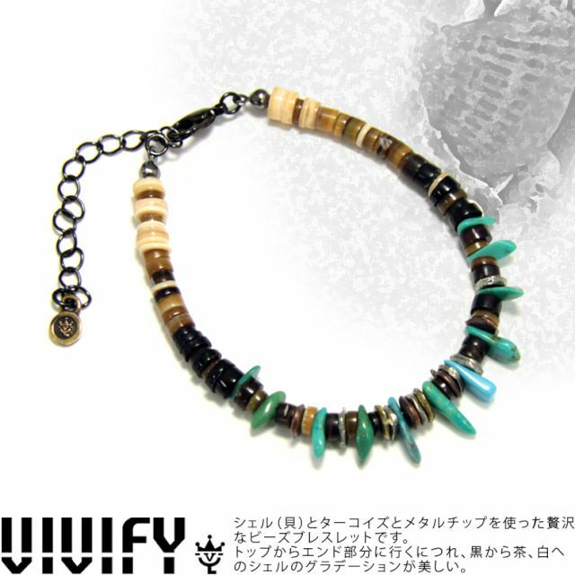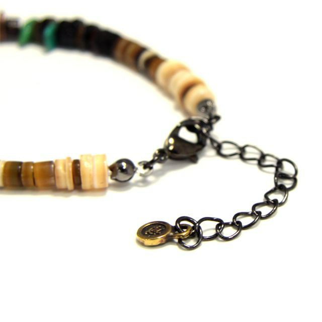 シェル(貝)とターコイズとメタルチップを惜しみ無く使った贅沢なビーズブレスレットです。トップ部分にターコイズとメタルビーズがランダムに、エンド部分に行くにつれ、黒から茶、白へのグラデーションのシェル使いが美しいビーズブレスレット。また、中心からずれた場所に穴が空いたターコイズを使う事により、放射状のバランスが目を惹き付けるデザインになっています。