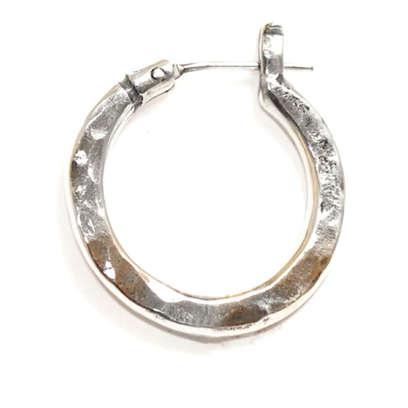 定番フープピアスの3mm肉厚ボディタイプです。ピアスの針の部分が可動する開閉式のピアスで、この開閉式により、ピアスのキャッチを紛失する不安が解消されました。ピアスの根元辺りに1本ラインがカービングされただけの、シンプルなデザインで、ハンマーで叩いた槌目の風合いがなんとも味わいのあるフープピアスです。