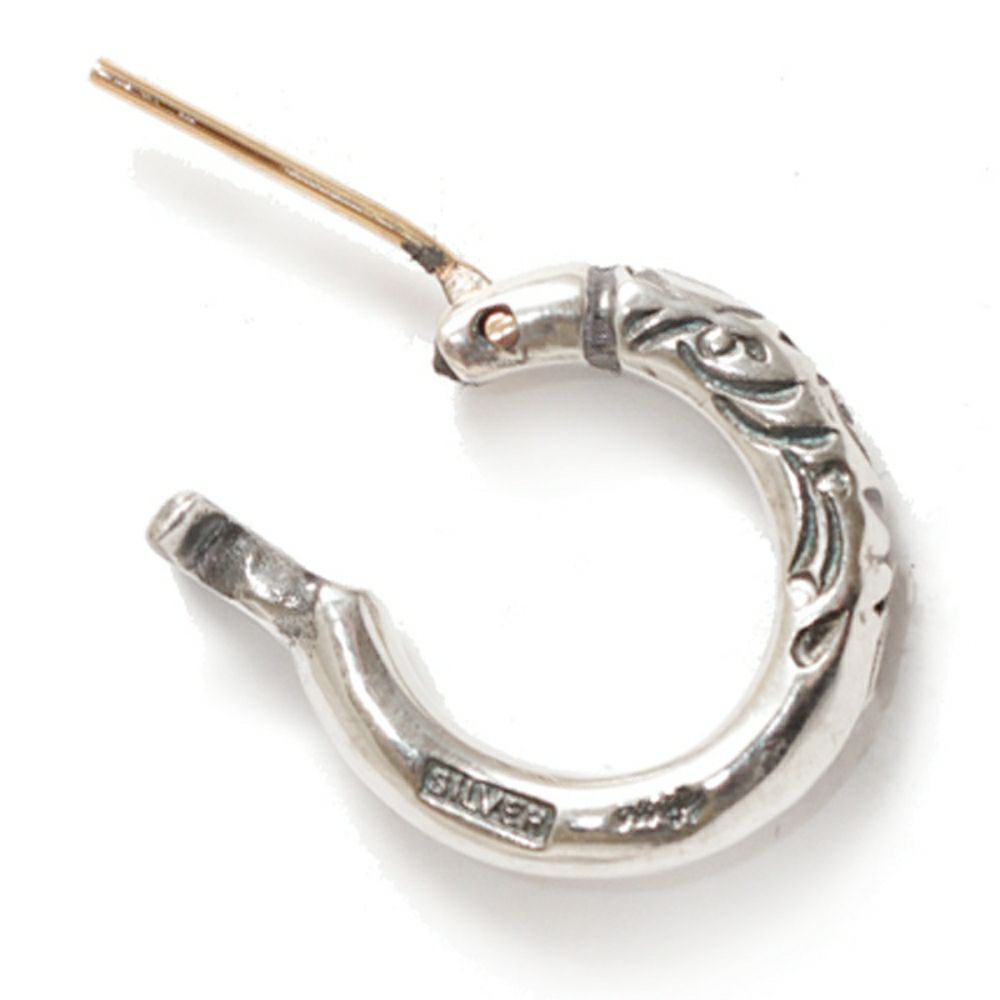 アラベスク(唐草模様)が施された3mm肉厚ボディで耳たぶを包み込む様な丁度良い着用感のフープピアス(S)ですピアスの針の部分が可動する開閉式のピアスで、この開閉式により、ピアスのキャッチを紛失する不安が解消されました。金属アレルギーを起こしにくいとされるk18製の針を使用し、アレルギーが原因でシルバー製がお悩みだった方にも着用でき、(個人差があります)そうでない方も、ピアスの針とボディを接続するカシメにもk18ゴールドを使用し、見た目にも金銀のコントラストが美しく着用時にも根元でゴールド色がさりげないアクセントとなっているワンランク上のアイテムをお望みの方にも最適です。模様を1つ1つタガネで刻印してますので、個体差があり、同じ物は2つとない特別感のあるフープピアスです。
