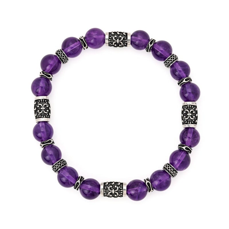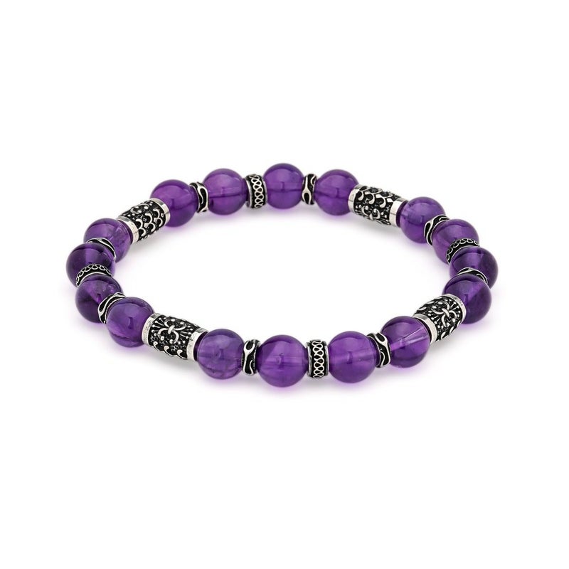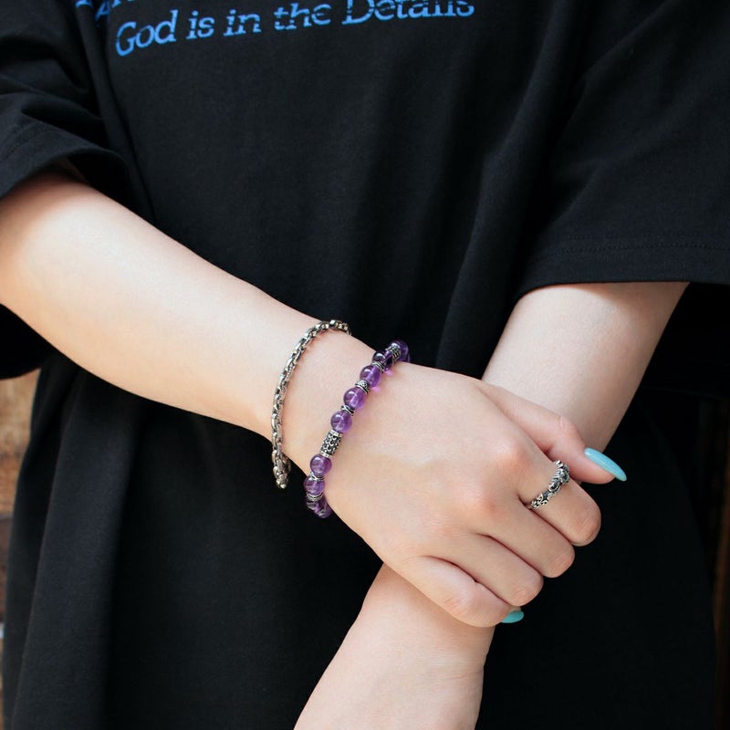 小振りサイズのシルバービーズに心を落ち着かせると言われるアメシストを組み合わせた、腕元に程よい存在感を与えてくれる8mm幅のストーンブレスレット。