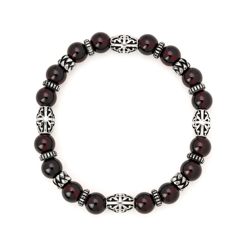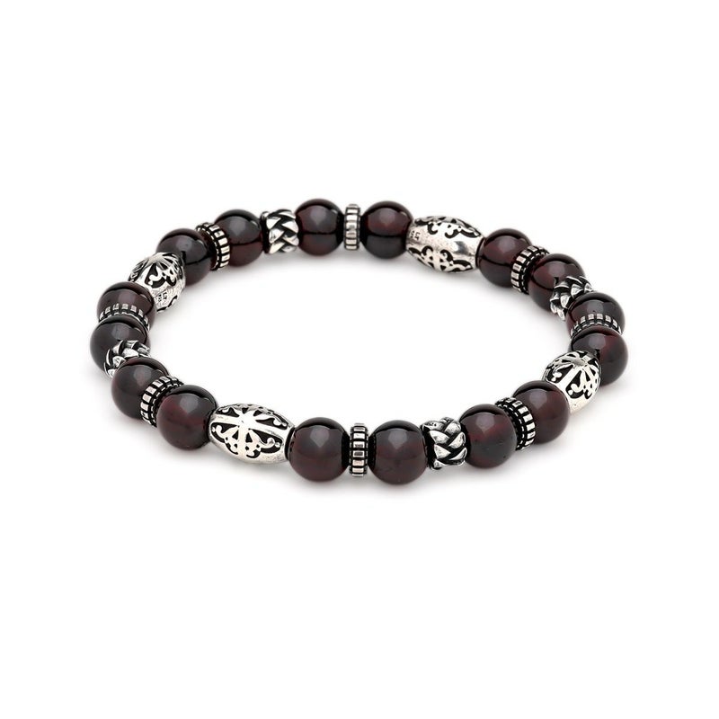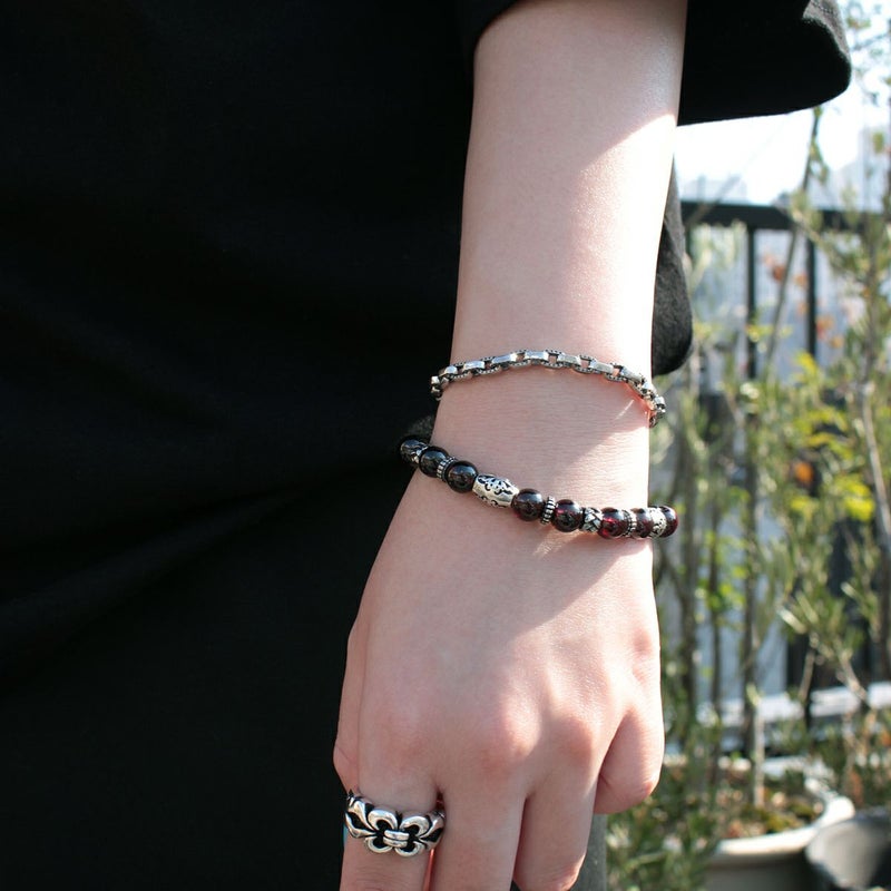 小振りサイズのシルバービーズに大切な人との絆を深めると言われるガーネットを組み合わせた、腕元に程よい存在感を与えてくれる8mm幅のストーンブレスレット。