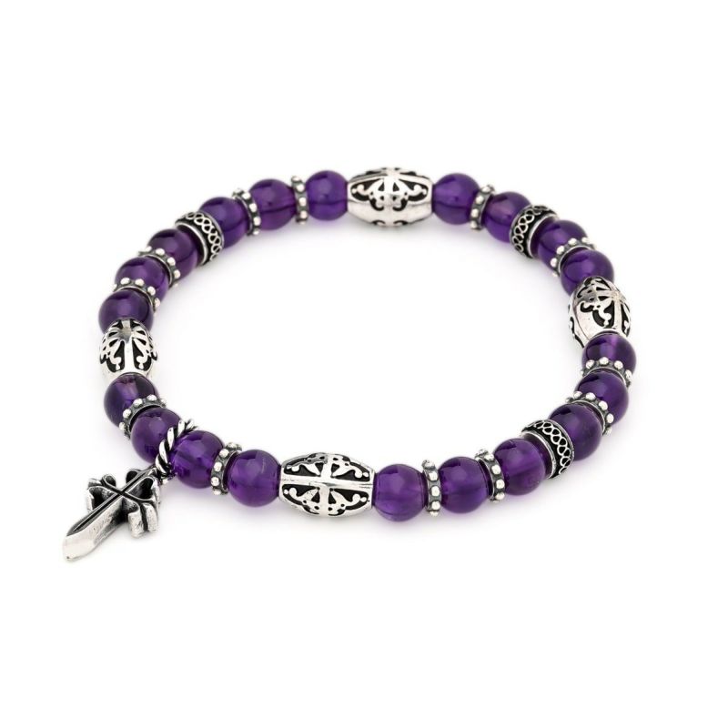 心を落ち着かせると言われるアメシストを組み合わせた6mm幅のストーンブレスレットに、アクセントとしてポリチーノクロスのチャームをプラスしたアイテム。