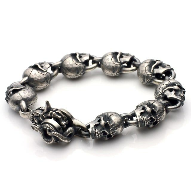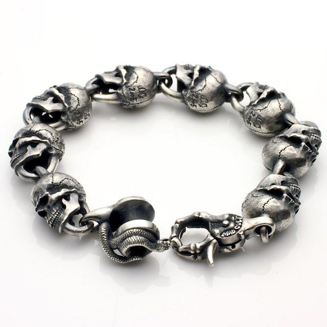重厚感のある作りに加え細部まで繊細な彫金を施している。スカルはあえて光沢を抑えた作りにすることでダークなイメージに仕上げている。