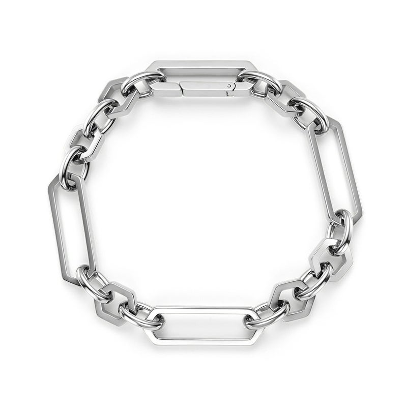 重厚感のあるブレスレットは、着けるだけでコーディネートがキリッと締まるステートメントアイテムです。インビジブルクラスプ(隠し留め具)を採用し、見た目はモードでも着脱は簡単で、機能性とデザイン性を両立しています。