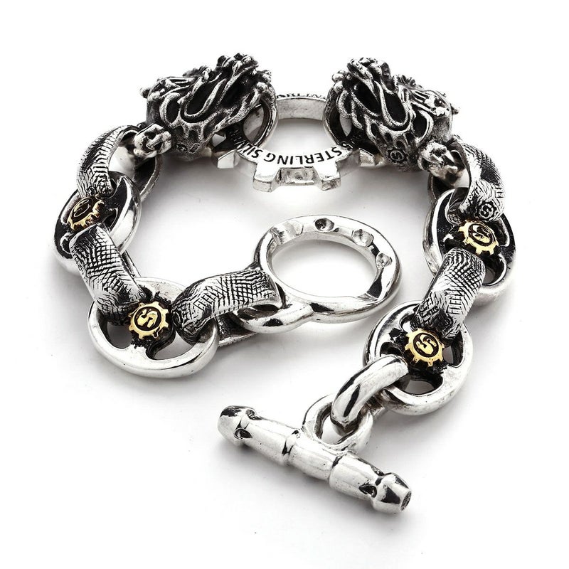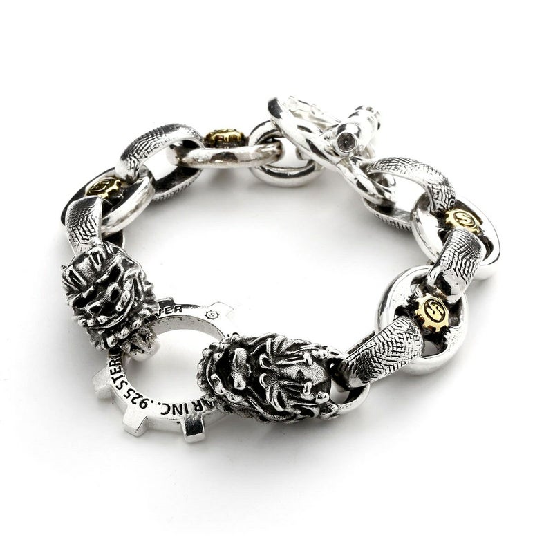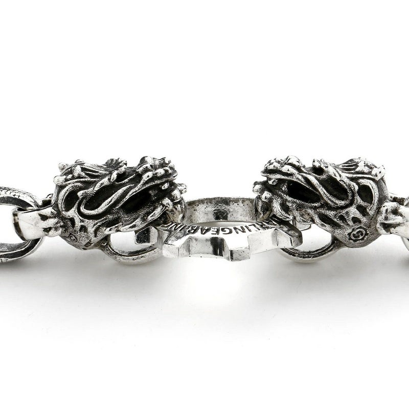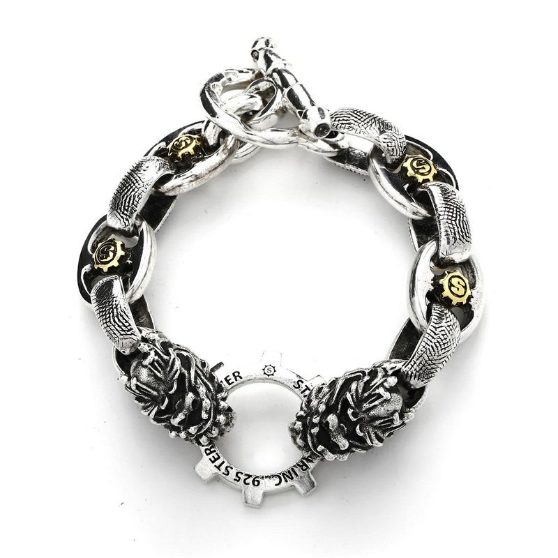 コック以来となるアニマルモチーフから『ドラゴン』が登場、人気のセンターギアフープブレスレット、さらにドラゴンの肌質をフューチャーしたスネイクリンクがカスタムされた1品。1stアンカーにブロンズ(青銅)のSギアロゴを乗せた拘りある作品。