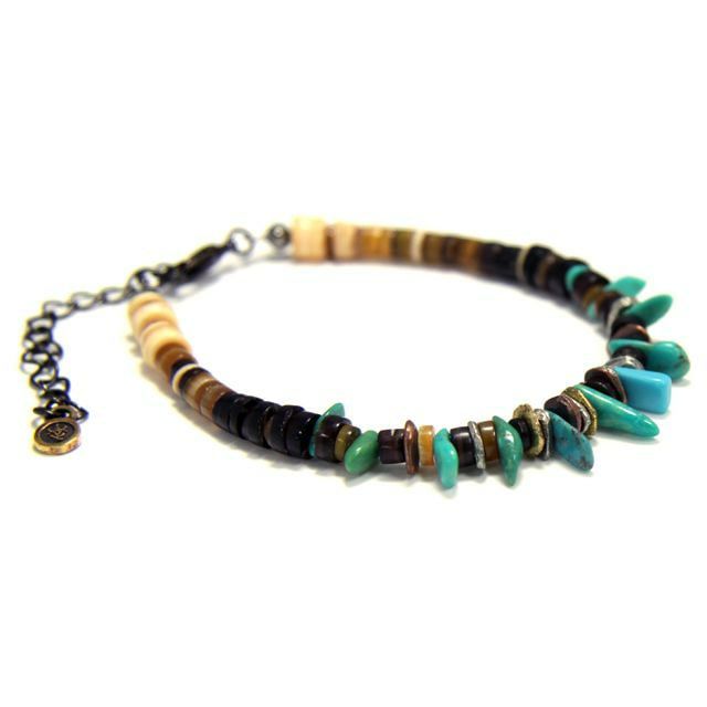 シェル(貝)とターコイズとメタルチップを惜しみ無く使った贅沢なビーズブレスレットです。トップ部分にターコイズとメタルビーズがランダムに、エンド部分に行くにつれ、黒から茶、白へのグラデーションのシェル使いが美しいビーズブレスレット。また、中心からずれた場所に穴が空いたターコイズを使う事により、放射状のバランスが目を惹き付けるデザインになっています。