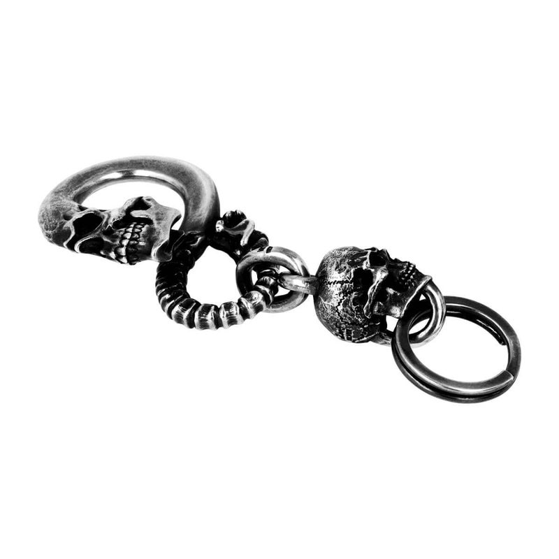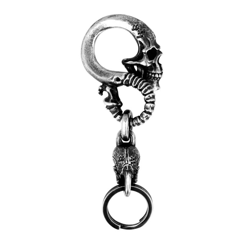大振りの頭蓋骨から尾てい骨までの流れるラインを、着用時に外れないよう独自のS字構造で再現したキーチェーン。フックの下に立体的なスカルをリンクさせることで、デザインが際立つ長さにまとめられている。