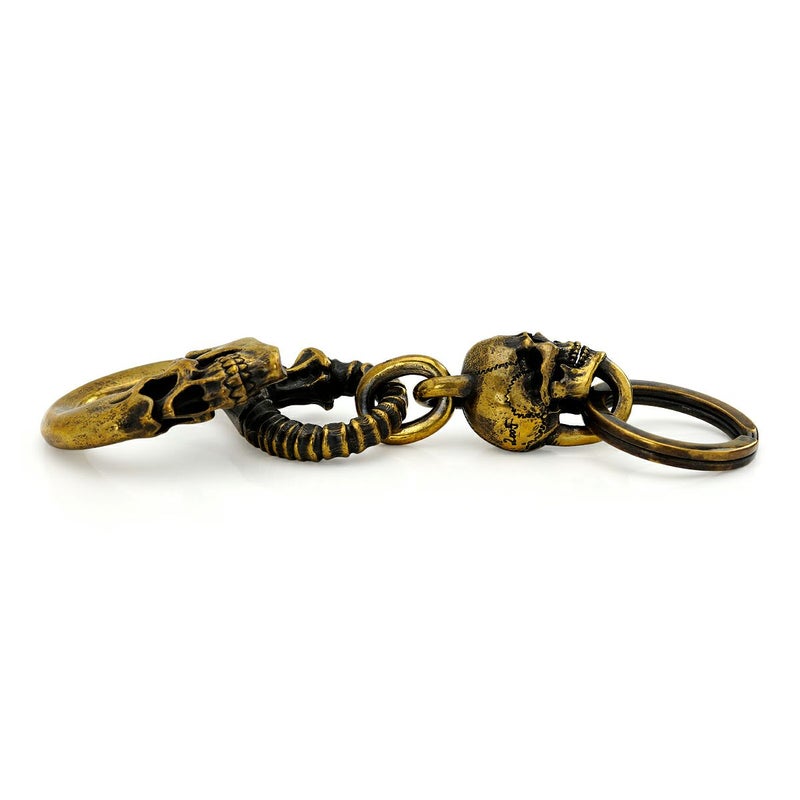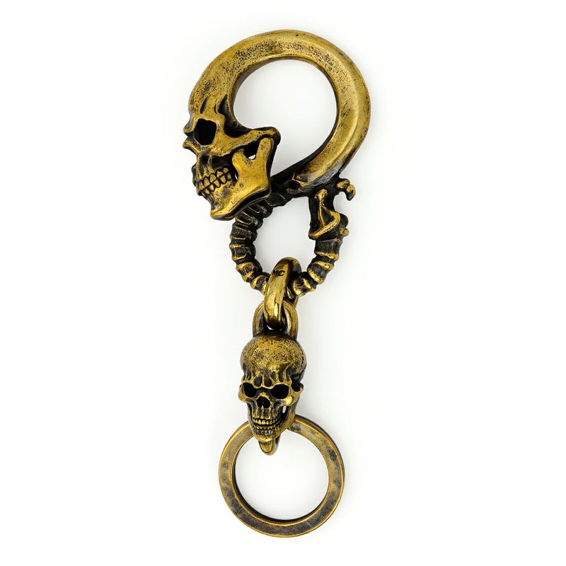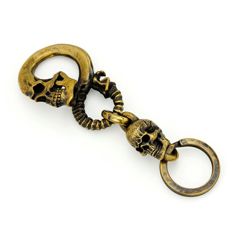 大振りの頭蓋骨から尾てい骨までの流れるラインを、着用時に外れないよう独自のS字構造で再現したブラス素材のキーチェーン。