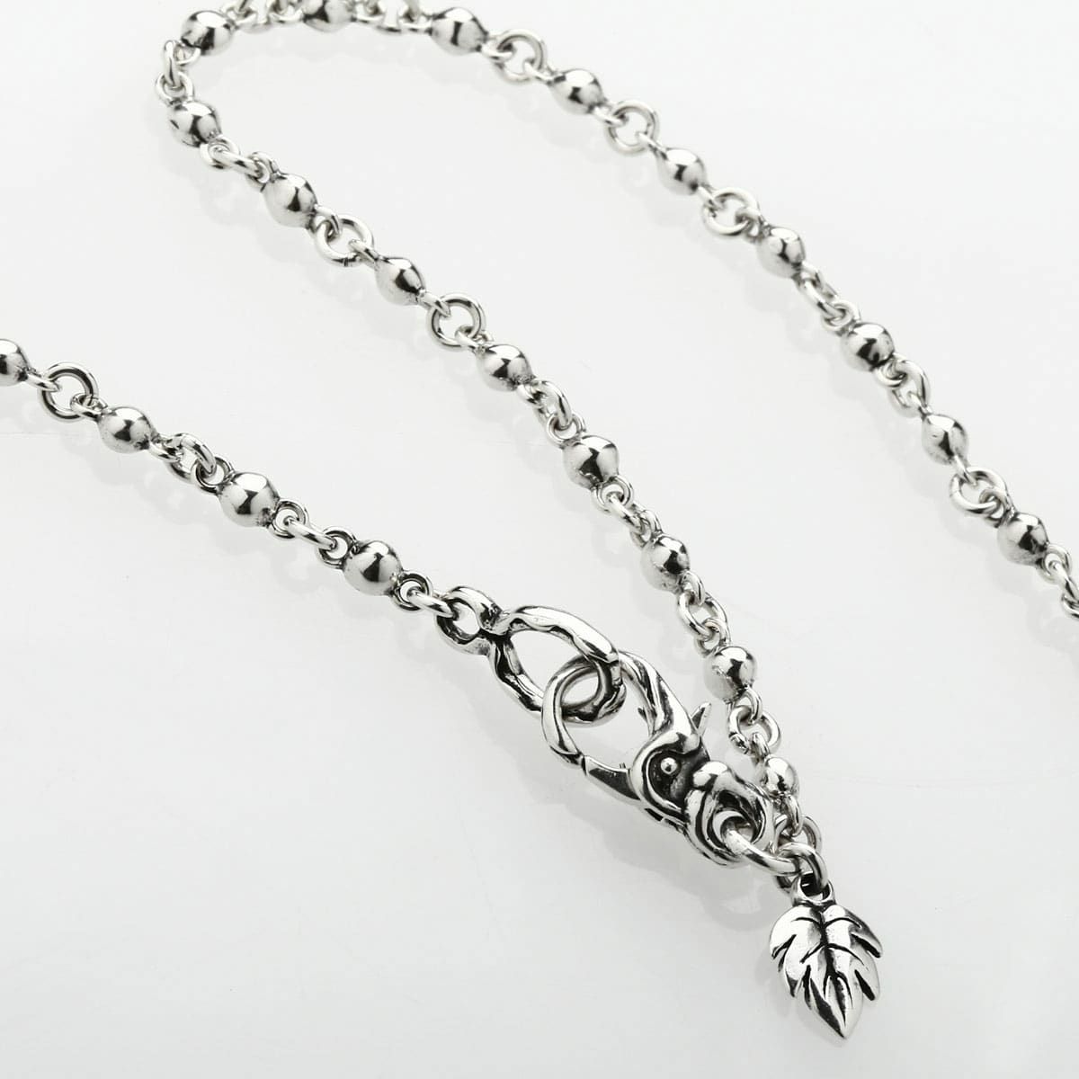 葉に乗る雨粒をイメージしたネックレス。雨粒のようにぷっくりとしたフォルムは、光に反射してキラキラと輝きます。雨粒が地面に落ちていく様を表現した大きさが異なるパーツは、立体感と動きを強調させるポイントとなっています。